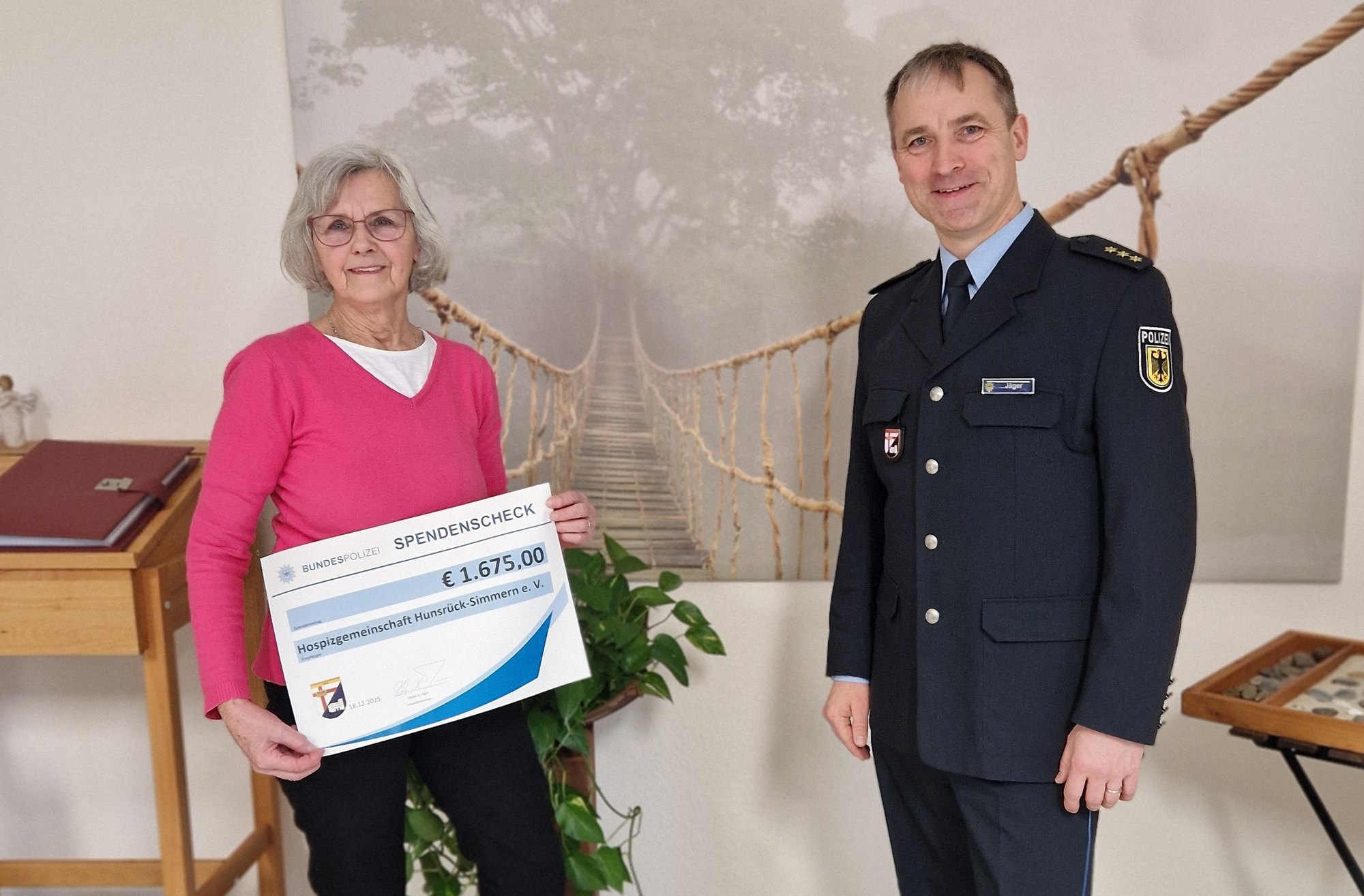 So konnte sich die Hospizgemeinschaft Hunsrück-Simmern e.V. über eine Gabe in Höhe von 1.675 Euro freuen. Polizeidirektor Stefan Jäger, Leiter der Bundespolizeiinspektion Trier, überreichte den symbolischen Spendenscheck an Erika Görhardt, 1. Vorsitzende der Hospizgemeinschaft.