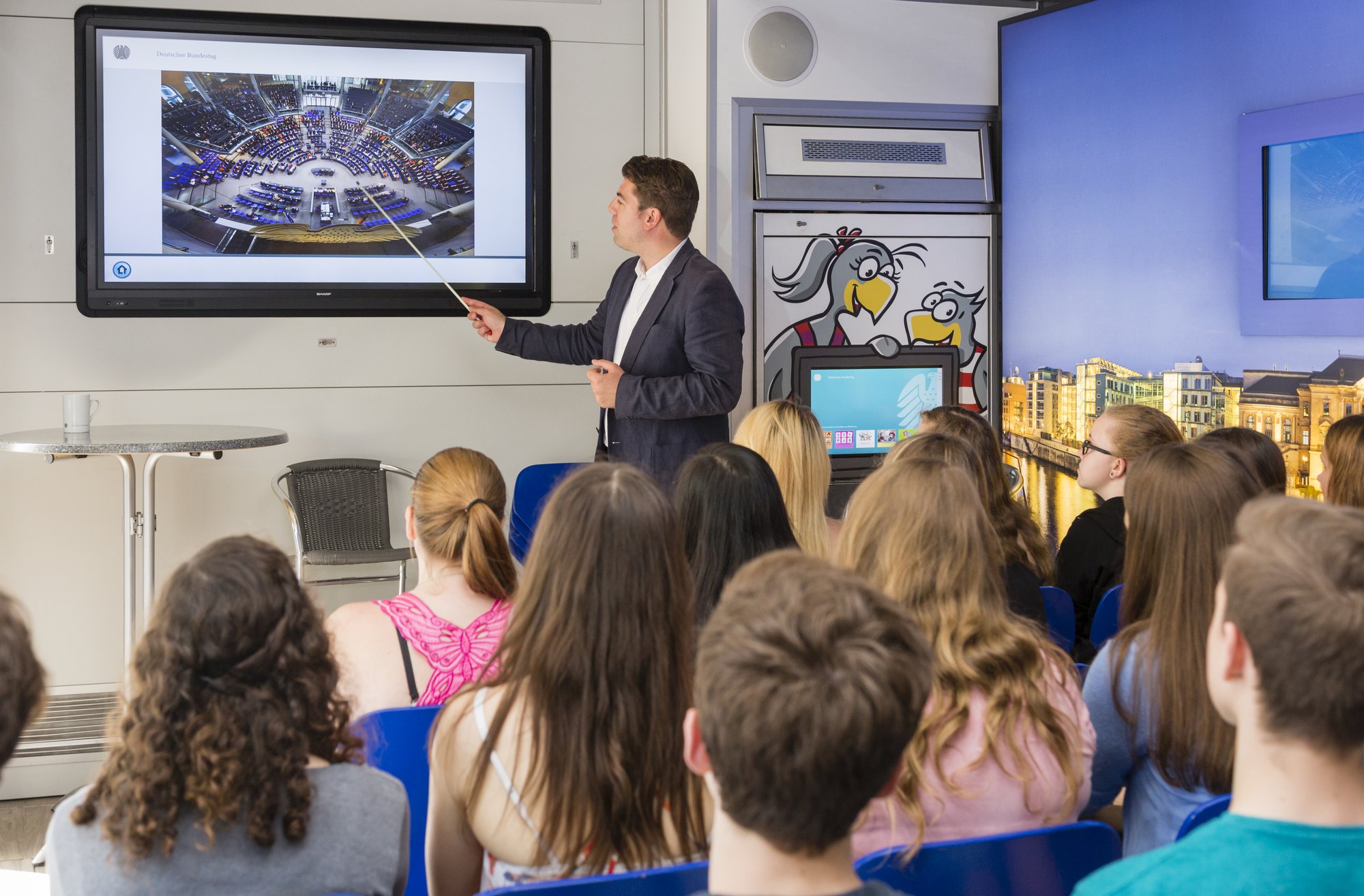 Auf den modernen Computern mit Touchscreen können Interessierte an einem Parlamentsquiz teilnehmen und weitere Spiele rund um den Bundestag spielen. Erwachsene können bei einem Quiz ihr Wissen rund um den Deutschen Bundestag, zum Beispiel hinsichtlich der Arbeitsweise des Parlaments, testen. Das multimediale Angebot steht auch auf einem höhenverstellbaren Computerterminal zur Verfügung, sodass Rollstuhlfahrer das Angebot ebenfalls nutzen können. Ein kindgerechter Computer lockt mit einem auf Kinder zugeschnittenen Angebot. Kinder können dort beispielsweise den Film »Applaus für Felix« schauen und ein Parlamentsquiz in zwei Schwierigkeitsstufen spielen. Außerdem gibt es ein Memospiel mit der sympathischen Comicfigur Karlchen Adler.
