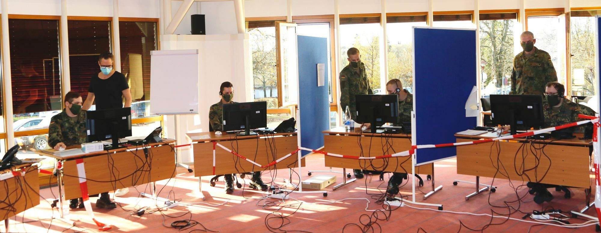 „Die rasant zunehmende Zahl der COVID 19-Infektionen im Landkreis in den vergangenen Wochen und die damit verbundene Kontaktnachverfolgung, haben uns an die Kapazitätsgrenze gebracht. Über den Einsatz von Mitarbeiterinnen und Mitarbeitern aus der Kernverwaltung hinaus, bin ich dankbar, dass uns bereits seit Anfang August vier Personen aus Landesbehörden bei unseren Aufgaben unterstützen. Vor fast vier Wochen haben wir noch schnell und unkompliziert die Hilfe durch das Informationstechnikbataillon 282 Kastellaun erhalten“, erläutert Landrat Dr. Marlon Bröhr. Zunächst wurden 14 Soldaten vom Personal des Gesundheitsamtes mit den Aufgaben vertraut gemacht. Im wöchentlichen Wechsel waren dann jeweils sieben Soldaten bei der Kontaktnachverfolgung in der Kreisverwaltung im Einsatz. Zwischenzeitlich konnte die Zahl auf 11 Soldaten je Woche aufgestockt werden, die das Gesundheitsamt unterstützen. Darüber hinaus konnten über die Kreisverwaltung vier Soldaten in der Hunsrückklinik Simmern eingesetzt werden, welche bis Anfang Dezember die gesundheitliche Eingangskontrolle übernehmen.