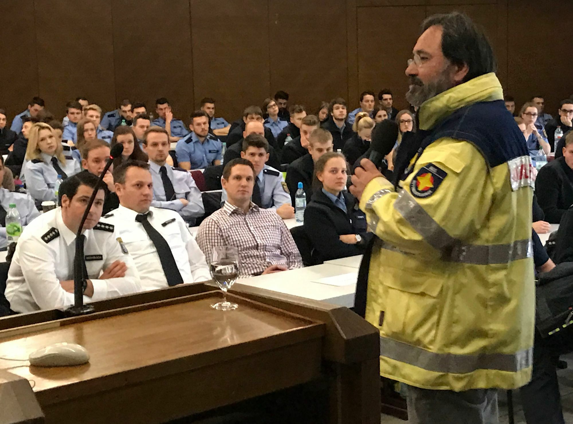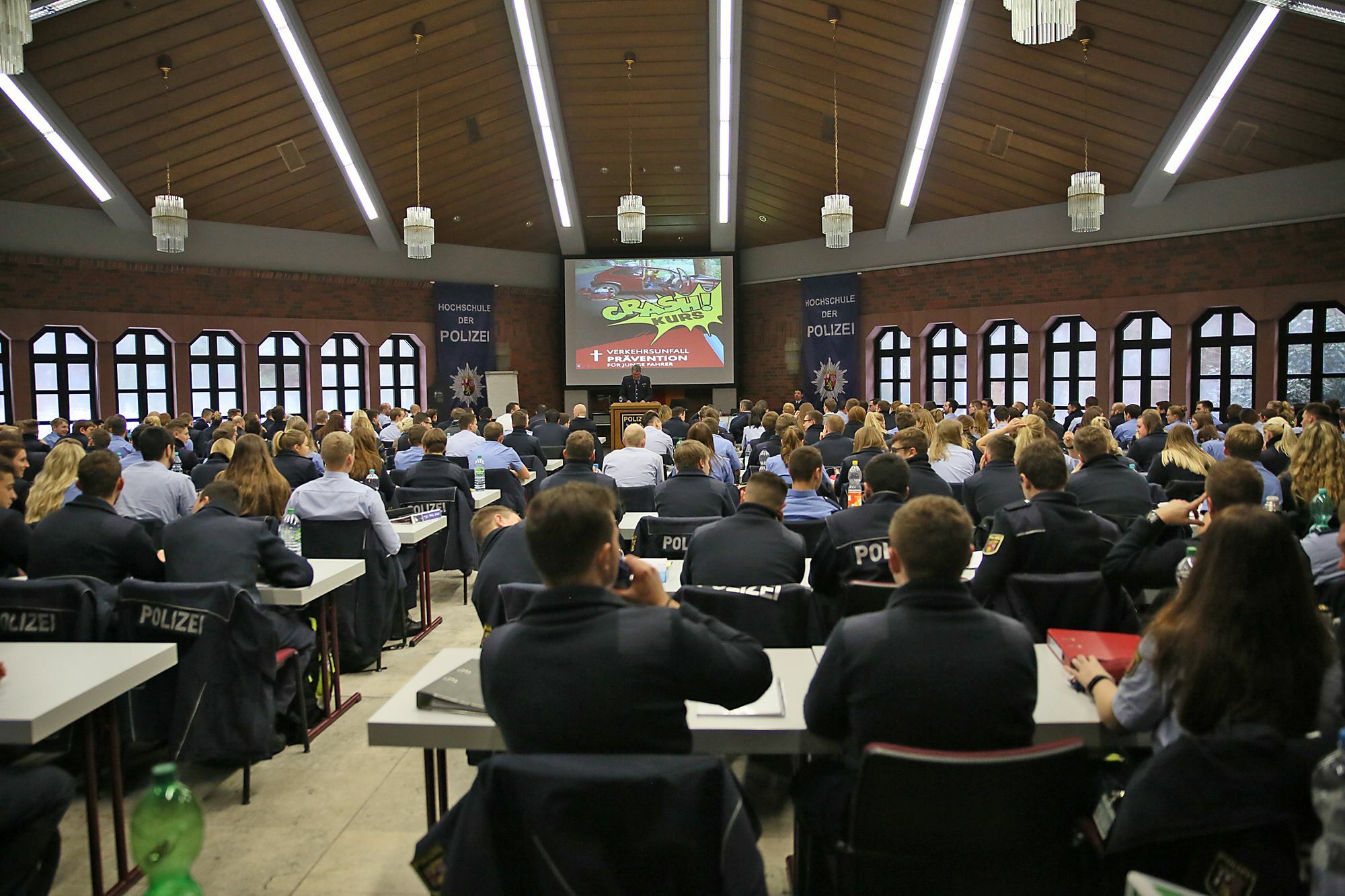 Aktuell nahmen der 16. Bachelor-studiengang sowie der Masterstudiengang Polizeimanagement an dieser Präventionsveranstaltung teil. Die Teilnehmer wurden mit der Realität einer realen Unfalllage aus Frankenthal mit tödlichem Ausgang konfrontiert. „Wir wollen in der Verkehrsunfallprävention neue Wege gehen und Ihnen die Einstellung der Unverletzlichkeit nehmen. Auch beabsichtigen wir die emotionale Ebene der Teilnehmer anzusprechen und eine persönliche Betroffenheit zu erzeugen“, nennt Polizeioberrat Patrick Brummer gleich zum Auftakt die Zielsetzung des Projekts. Großformatige Fotos von der Unfallstelle und eine authentische und sehr emotionale Schilderung persönlicher Erlebnisse von den vor Ort eingesetzten Einsatzkräften der Polizei, der Feuerwehr und der Notfallseelsorge lieferten intensive Eindrücke vom Geschehen. Dabei wurde nichts beschönigt. Alles war sehr emotional und ergreifend. Für alle an der Unfallstelle eingesetzten Kräfte bot sich ein Bild des Grauens. Betroffenheit unter allen Anwesenden. Bilder und Stimmen, die in Erinnerung bleiben und zum Nachdenken anregen. Tiefe Betroffenheit ist in den Gesichtern zu sehen. „Spätestens jetzt wurden jedem von uns die Gefahren durch unvorsichtiges Autofahren bewusst. Ich hätte nicht gedacht, dass der Crash-Kurs mich so berührt“, sagte ein Student, den insbesondere die authentischen Schilderungen der Einsatzkräfte hervorhob. Das Projekt an der Hochschule der Polizei Rheinland-Pfalz stieß zwischenzeitlich auch im Land und über die Landesgrenzen hinweg auf reges Interesse. So wurden durch den Crash-Kurs bisher rund 4 000 junge Fahrer und Fahrerinnen in Rheinland-Pfalz erreicht.