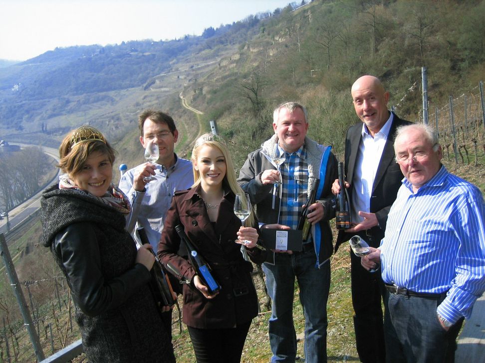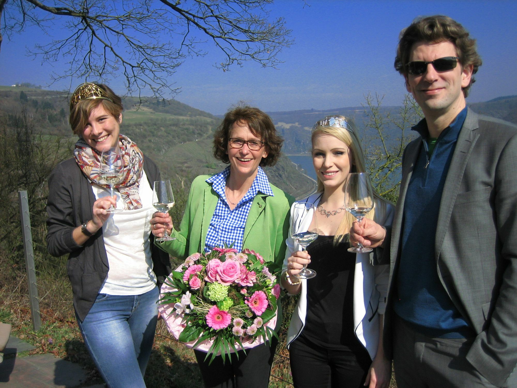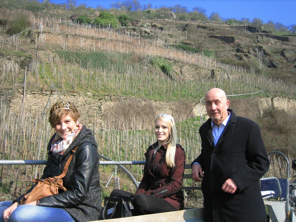 Nachdem die jungen Frauen im Schlosshotel auf Burg Rheinfels Quartier bezogen, begann das Besuchsprogramm mit Königinnenwetter, blauem Himmel und viel Sonnenschein. Mit dem „Schnauferl“ chauffierte Hoteldirektor Andreas Ludwig die jungen Frauen zum ersten Programmpunkt in den Oelsberg. Dort wurden sie von Bürgermeister Thomas Bungert erwartet, der sie per „Monoracking“ mit 10 PS zur Endstation hoch in den Weinberg brachte. Gerhard Lambrich hatte in luftiger Höhe für ein kleines Frühstück gesorgt und bei Spundekäs` und Brezel stieß man mit einem Riesling „Mythos“ auf die schöne Landschaft, den sonnigen Tag und den hohen majestätischen Besuch in der Verbandsgemeinde St. Goar – Oberwesel an.