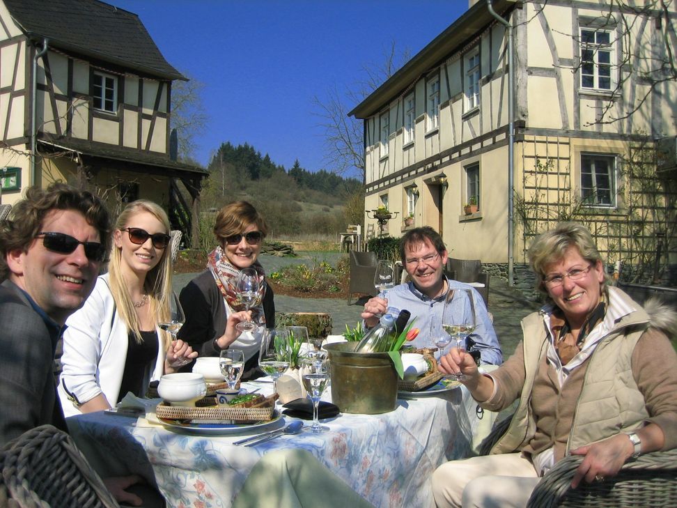 Bei der nächsten Rast am Günderode Filmhaus war relaxen angesagt. Landrat Dr. Marlon Bröhr, 1. Vorsitzender des Mittelrhein-Wein e.V. gesellte sich zur Wandergruppe und Hausherrin Petra Litz servierte regionale Küche zur Mittagszeit.
