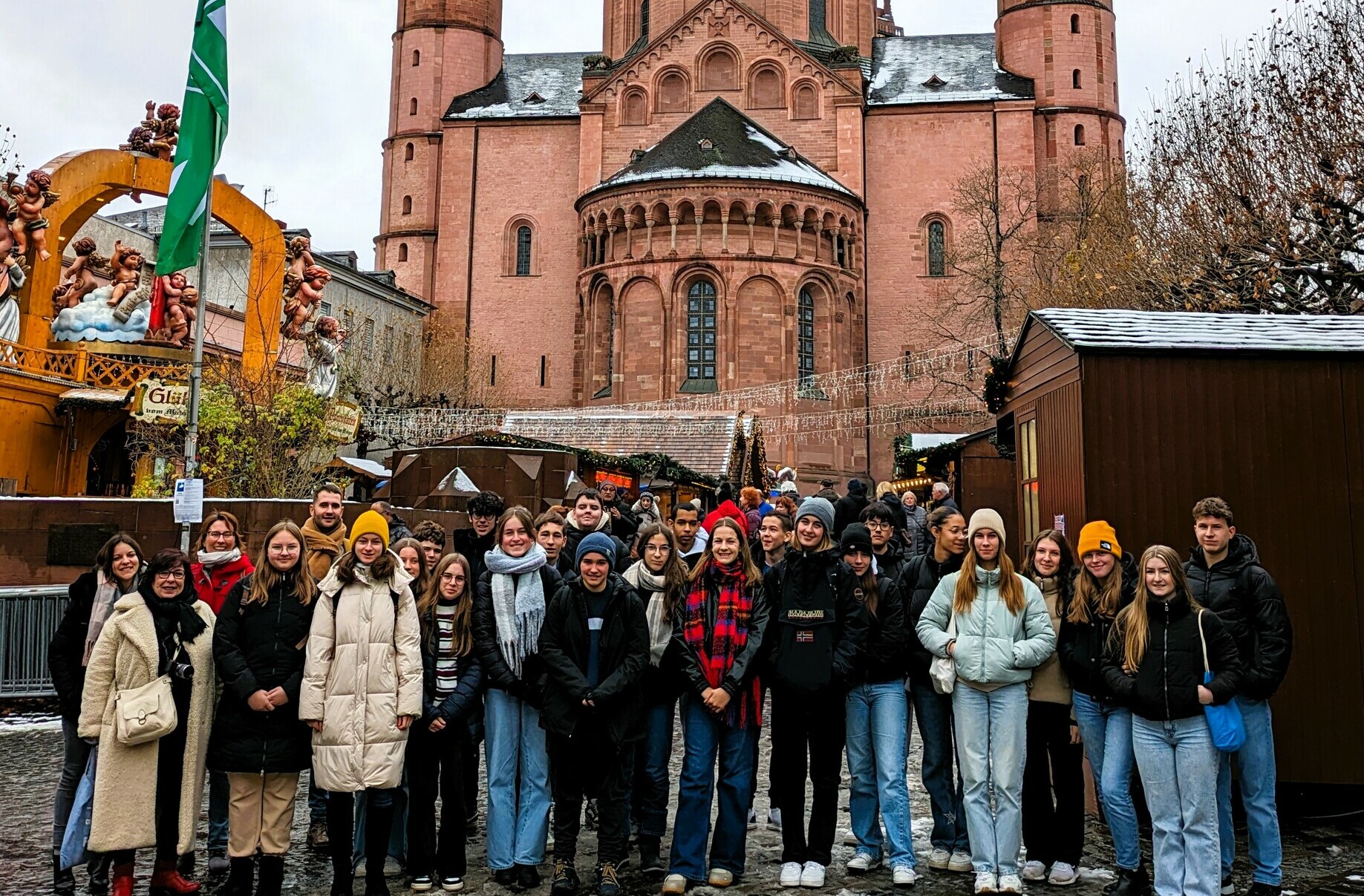 Das gemeinsame Programm umfasste sowohl sportliche Aktivitäten als auch Kultur und natürlich durfte gerade in der Vorweihnachtszeit der ein oder andere Weihnachtsmarkt mit alkoholfreiem Punsch nicht fehlen! Unser Bild zeigt die Gruppe mit den begleitenden Lehrern M. Alloin und Mme Carnavat aus Mâcon, Frau Sarindar aus Emmelshausen und Frau Klingseisen aus Kastellaun, beim Ausflug nach Mainz vor dem Dom, auch St. Stephan mit den berühmten Chagall-Fenstern und das Gutenberg-Museum wurden besucht. Hauptsächlich aber erlebten die Franzosen eine ganze Woche lang das Leben in einer Familie in Deutschland, mit all seinen Tücken und ungewohnten Begebenheiten.