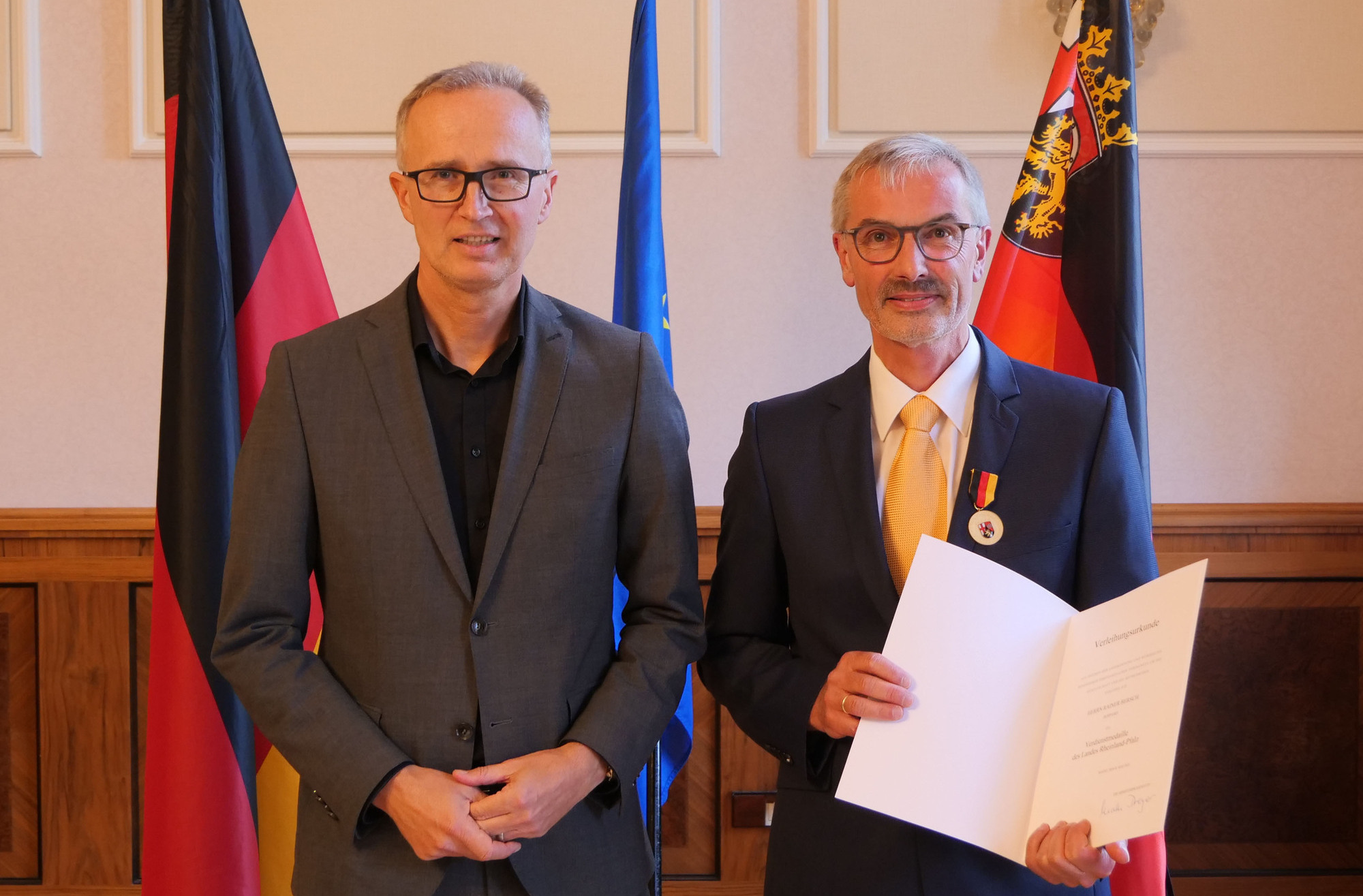 Für sein Engagement sprach ihm Vizepräsident Kaschny Dank und Anerkennung aus. Bei der Feierstunde in der SGD Nord waren seine Familie, Freunde sowie kommunale Vertreter anwesend. Für den Landkreis Rhein-Hunsrück die Erste Kreisbeigeordnete Rita Lanius-Heck, für die Stadt Boppard Jörg Haseneier. Anreger der Auszeichnung war der Kreismusikverband Rhein-Hunsrück vertreten durch Christoph Schnaß (2.Vorsitzender).