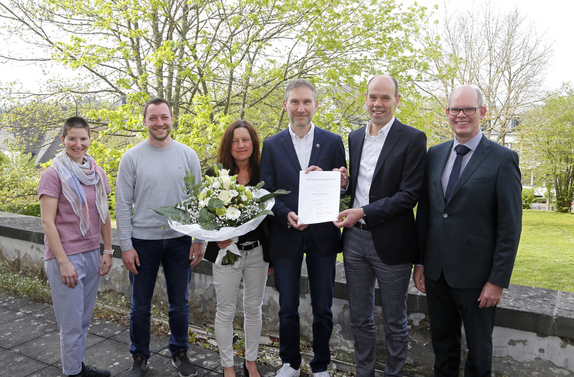 Bei der Aushändigung der Urkunde und der Ehrennadel würdigte Landrat Volker Boch das hohe ehrenamtliche Engagement, seine Leidenschaft für die Musik und seinen wichtigen Beitrag in der Kinder- und Jugendbildung. Weiter überreichte er einen Blumenstrauß an Ehefrau Gabi, die sich ihren Mann mit der Musik teilen muss. "Ich wünsche mir sehr, dass Sie in Zukunft noch viele innovative Ideen umsetzen und so Menschen für die Musik begeistern werden", gratulierte Landrat Boch Herrn Klein und überreicht auch ein Weinpräsent. Bürgermeister Christian Keimer gratulierte und überreichte ebenfalls ein Weinpräsent: "Ich bedauere sehr, dass es in meiner Jugend diese Möglichkeiten noch nicht gab. Als Bürgermeister der Verbandsgemeinde und der Stadt sage ich danke für die Qualität Ihrer Arbeit. Sie ist im Hunsrück einzigartig und hat Strahlkraft weit über Kastellaun hinaus."