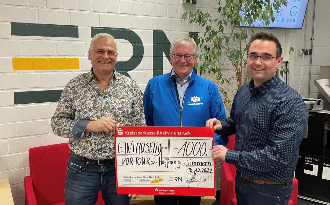 Simmern. Zu Weihnachten hat die ERN Elektrosysteme Rhein-Nahe 1 000 Euro an die Vor-Tour der Hoffnung gespendet. Die Geschäftsführer Egon Göttel und Tobias Scheid übergaben die Spende an Kümmerer Hans-Josef Bracht. Tobias Scheid wörtlich: »Es geht uns gut und wir sehen uns wie andere Unternehmen auch in einer gesellschaftlichen Verantwortung. Wir wollen mit unserer Spende einen Beitrag im Kampf gegen Kinderkrebs und Leukämie leisten sowie hilfsbedürftigen Kindern eine Perspektive geben. Die Vor-Tour ist jedenfalls ein idealer Partner, der sicherstellt, dass Spenden zu 100 Przent am richtigen Platz ankommen!« Bracht dankte im Namen der Vor-Tour für die großzügige Unterstützung: »Leider legen Krebs und Leukämie auch in Corona-Zeiten keine Pause ein. Jede Spende zählt!«