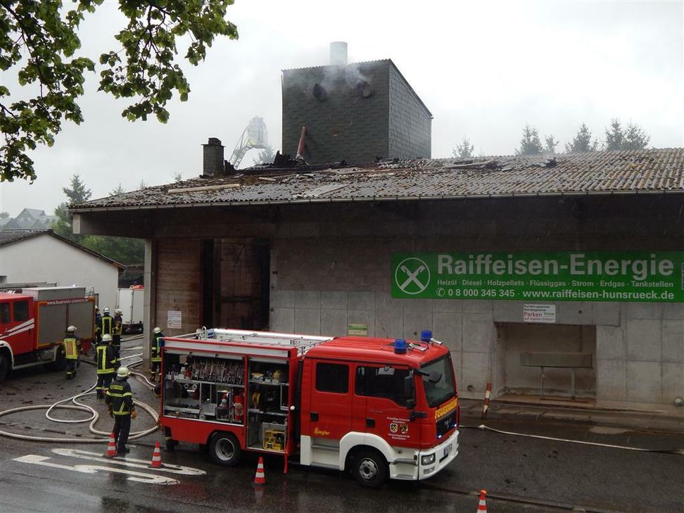 Durch die Wucht der Explosion werden sowohl das Dach der Lagerhalle als auch des Förderturmes erheblich beschädigt. Infolge der Verpuffung erleidet der Fahrer eines Lkw leichte Gesichtsverletzungen. Es entstand ein Sachschaden von über 100 000 Euro. Der Verkehr auf der angrenzenden L 220 musste abgeleitet werden, die Straßenmeisterei Simmern richtete eine Umleitungsstrecke ein. Für die Löscharbeiten waren insgesamt 99 Einsatzkräfte aus mehreren Wehren der VG Rheinböllen und VG Simmern im Einsatz.