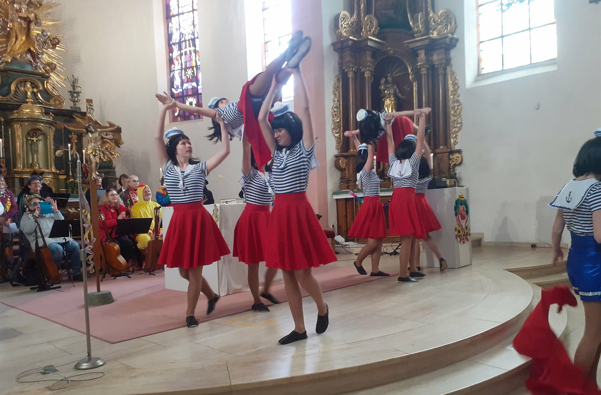Spiritueller Höhepunkt einer jeden katholischen Messe ist die Feier der Eucharistie (Abendmahl). Die wurde natürlich auch gefeiert, aber es gab dann einen weiteren Höhepunkt, nämlich den Auftritt der Tanzgarde des Karnevalsverein Simmern. Unter den Marschklängen der Orgel, intoniert von Bernd Loch, zogen sie durch den Mittelgang ein und machten den Chorraum vor dem Altar zu ihrer Bühne. Mit flotten Klängen und manch waghalsigen Hebefiguren begeisterten sie die Gottesdienstbesucher und erhielten zum Dank einen lang anhaltenden Applaus der Gläubigen. Auch Pastor Lutz Schultz war von der Tanzdarbietung sehr angetan: "Hier ist der Beweis, dass unser Herr Gott mit der Erschaffung der Eva, das nicht schlecht gemacht hat. Mit eurer Darbietung habt ihr auch dazu beigetragen Gott zu ehren", stellte Schultz fest.