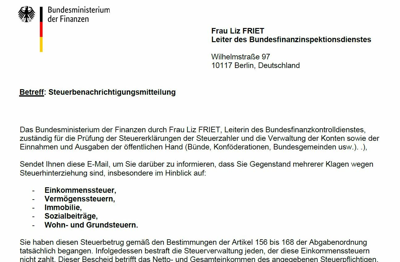 Dazu sollen die Empfängerinnen und Empfänger aufgrund einer angeblichen Steuerhinterziehung, zu der bereits Klageverfahren bestünden, einen hohen sechsstelligen Betrag zahlen. Ansonsten drohe Haft oder eine Geldstrafe in Höhe von 500 000 Euro. Das als PDF-Datei angefügte Schreiben enthält das Logo des Bundesfinanzministeriums und wird im Namen eines fiktiven "Bundesfinanzinspektionsdienst" versendet.