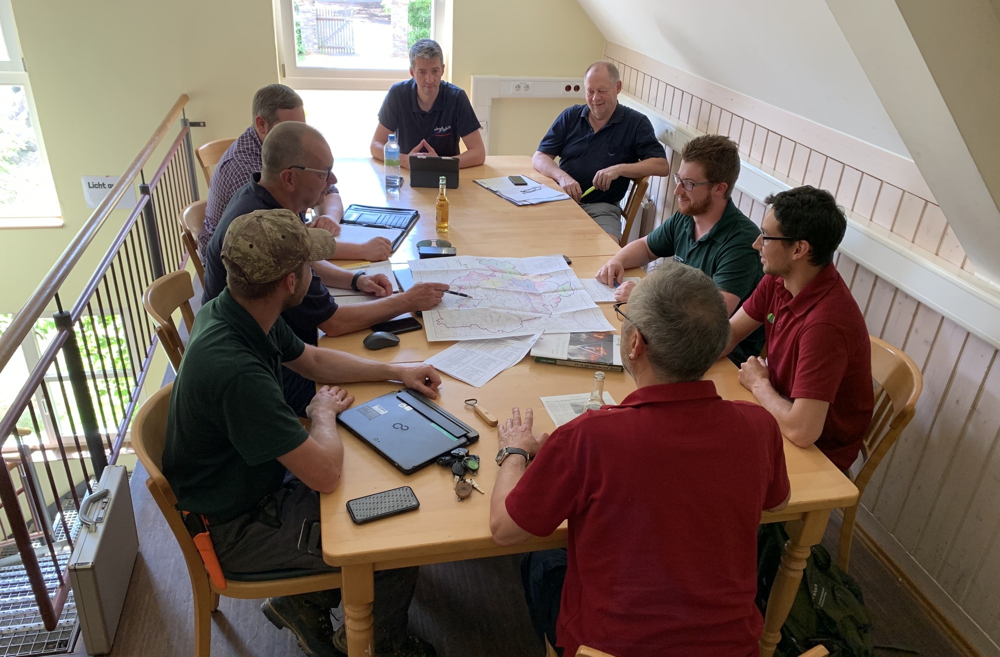 Besondere Inhalte dieser Besprechung waren u.a. die grundsätzliche Alarmierung der jeweiligen Revierleitungen im Brandfall, die Frage nach der Verfügbarkeit von Löschwasser vor Ort, bzw. wie geeignete Löschmittel an den jeweiligen Brandherd gelangen können. Die Forstämter hatten in der Vergangenheit Kartenmaterial erstellt, in dem z.B. potenzielle Löschwasserentnahmestellen sowie Stellflächen für temporäre Löschwasserbehälter vermerkt und Bestände mit einer besonders signifikanten Brandgefährdung eingezeichnet sind.