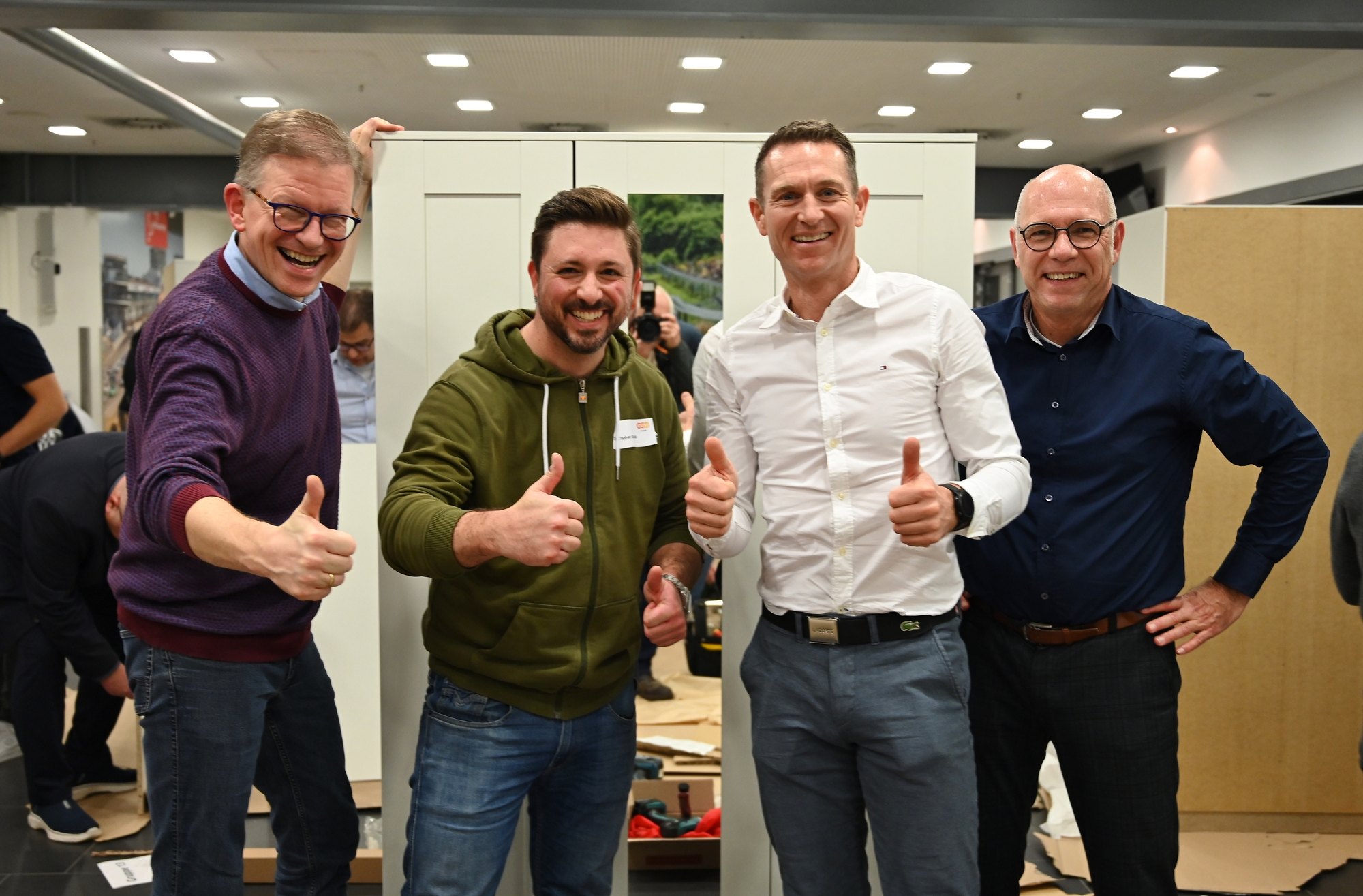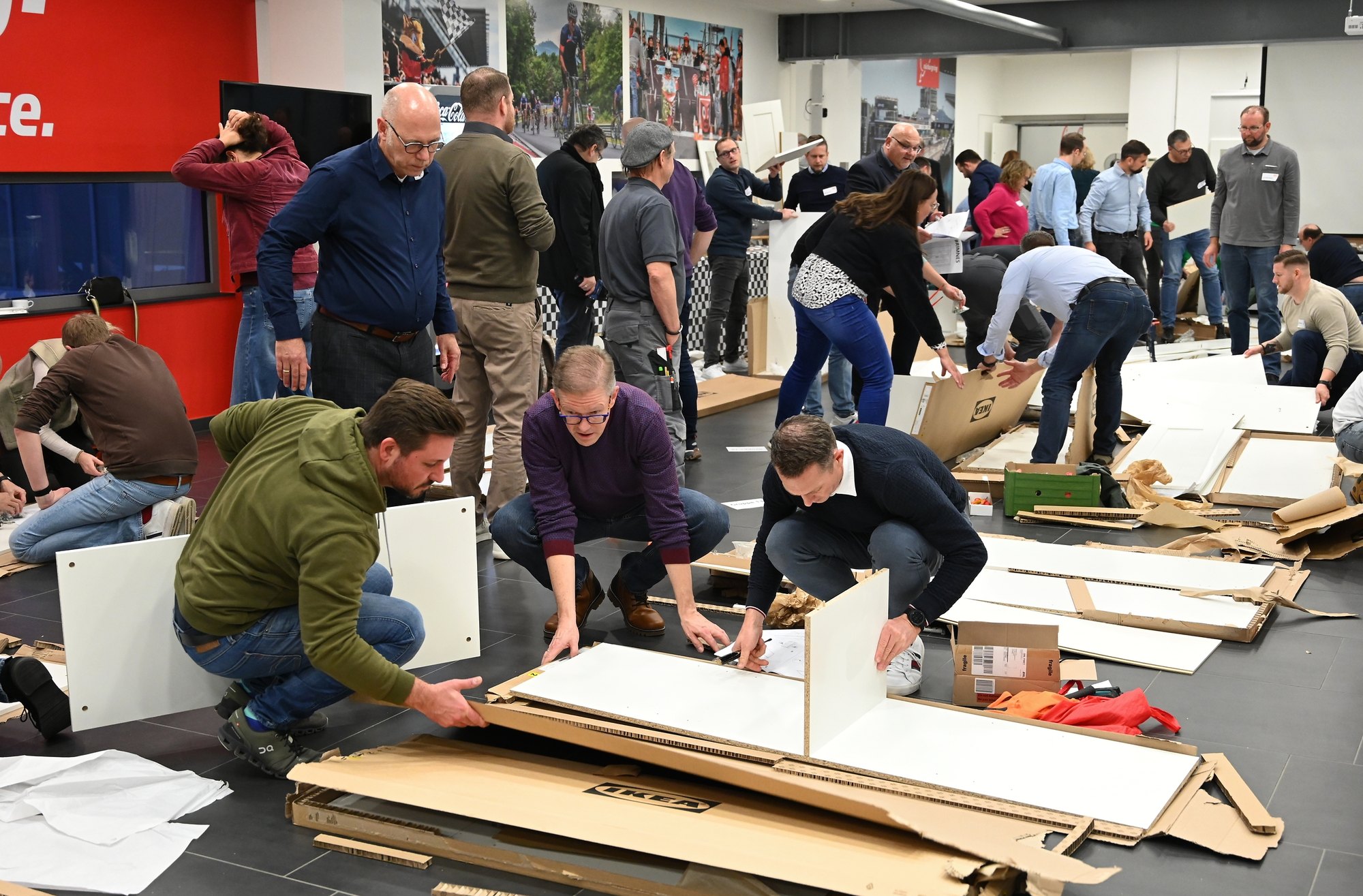 Gemeinsam anpacken für den guten Zweck: Diesem Motto folgend haben rund hundert Führungskräfte der Unternehmensgruppe Energieversorgung Mittelrhein (evm-Gruppe) Kleiderschränke montiert, die mehreren Jugendhilfeeinrichtungen gespendet werden. Die ungewöhnliche Aktion war eingebettet in das Führungskräftetreffen der evm-Gruppe am Nürburgring. Nach dem offiziellen Programm gaben sich die Mitarbeiterinnen und Mitarbeiter daran, die einzelnen Schrankteile zu montieren.