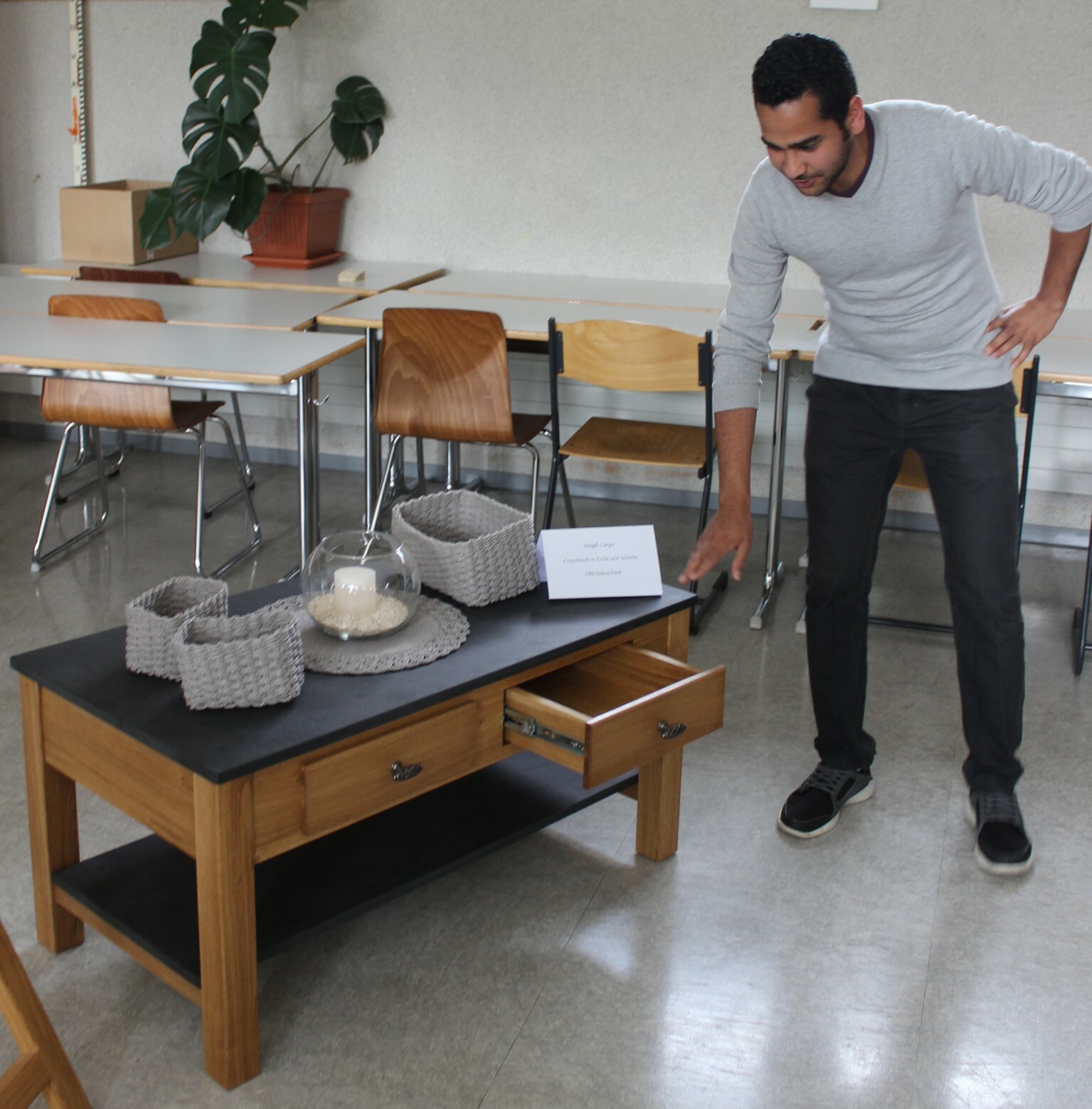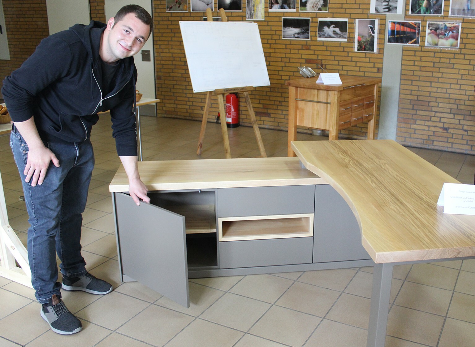 Markus Christ freut sich mit seinem ehrenamtlichen Prüferteam, dass fast alle Lehrlinge ihre Gesellenprüfung bestanden haben. Nur ein Prüfling muss im Winter die Kenntnisprüfung wiederholen. Nach theoretischer Prüfung in der Berufsschule, ihrem Gesellenstück und einer praktischen Arbeitsprobe können die jungen Männer im Hunsrück jetzt als Fachkräfte im Schreinerhandwerk in eine gute Zukunft starten. Ihnen allen merkte man bei der Ausstellung ihrer Gesellenstücke die Begeisterung für ihren kreativen Beruf an. „Arbeit muss auch Spaß machen“, sagt Sayk. Insgesamt bilden die 24 Schreinereien, die in der Tischler-Innung Simmern organisiert sind, 55 Lehrlinge in drei Lehrjahren aus. „In der Regel behalten die Lehrlinge ihre Gesellenstück ein Leben lang“, weiß der Fachlehrer. „Das sind Unikate, die mit viel Können, Schweiß und Herzblut angefertigt wurden.“ Stolz präsentierten die neuen Gesellen ihre Werke.