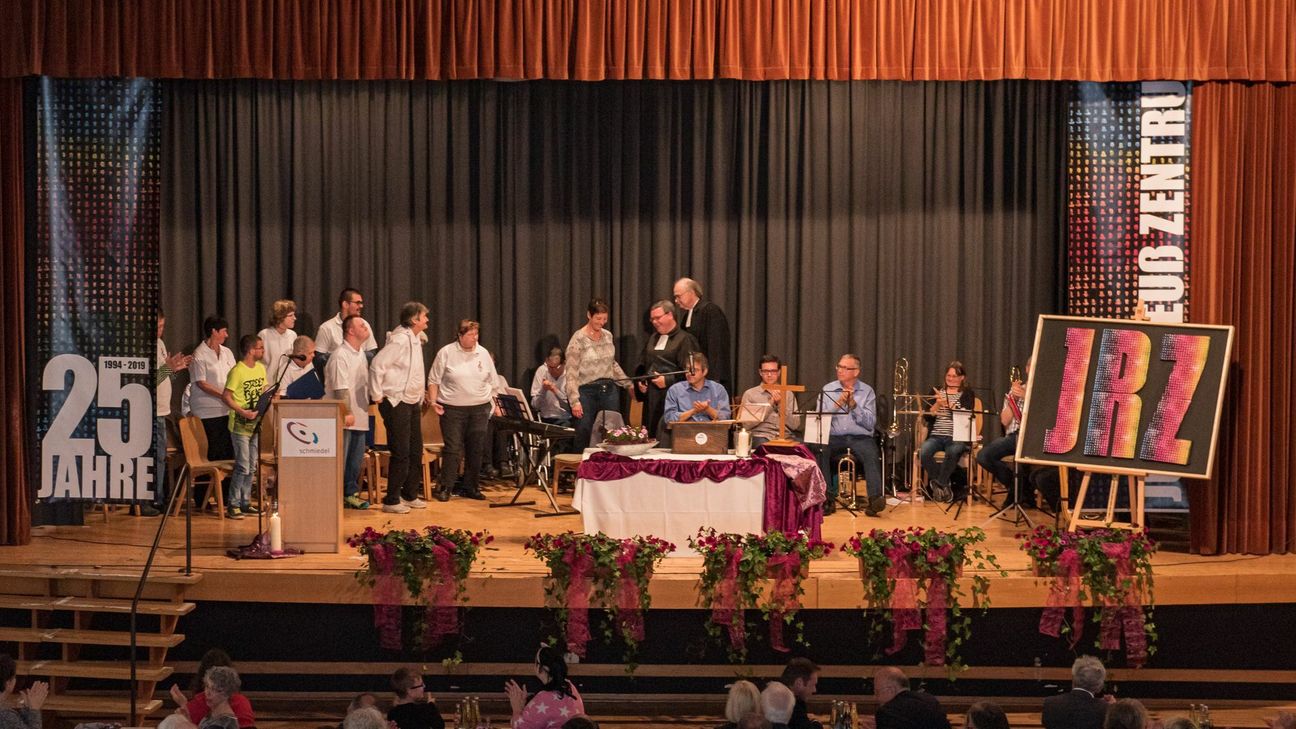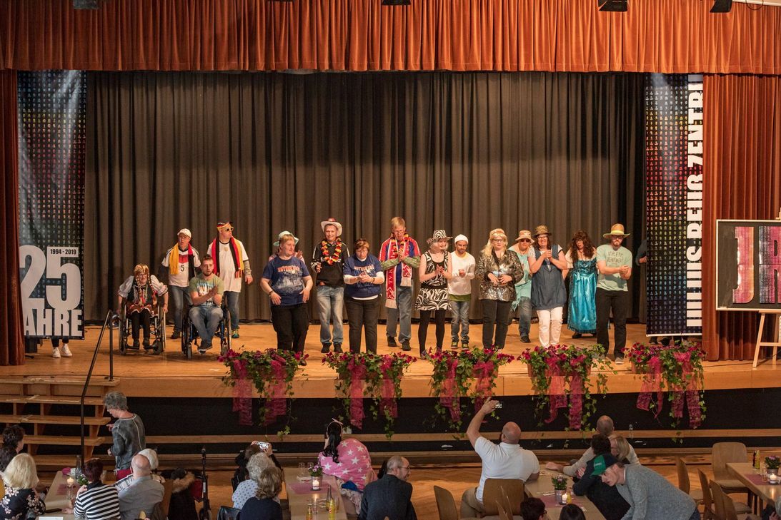 In einladender Atmosphäre eröffnete Rita Seeger als Vorständin des Schmiedel die Feierlichkeiten mit einer ansprechenden Eröffnungsrede. Sie begrüßte alle anwesenden Gäste, darunter die im Julius-Reuß-Zentrum lebenden Menschen, deren Angehörige, die Mitarbeitenden, sowie zahlreiche Gäste aus Politik und Gesellschaft und spannte den Bogen zu der Notwendigkeit, „Gesicht zu zeigen“. Auch die im Anschluss von Herrn Pfarrer Horst Hörpel i.R. und Herrn Pfarrer Knut Ebersbach gehaltene Andacht stellte das diesjährige Motto in den Mittelpunkt. Musikalisch untermalt vom Posaunenchor Kastellaun-Uhler, sowie vom hauseigenen Chor „Die Liedermacher“, wurde verdeutlicht, wie wichtig es gerade in der heutigen Zeit ist, sich für Vielfalt und Toleranz stark zu machen. Nach einem Grußwort durch Staatssekretär Dr. Alexander Wilhelm, der auf die vergangenen 25 Jahre Geschichte der Behindertenhilfe blickte und die bevorstehenden Veränderungen durch das stufenweise inkrafttretende Bundesteilhabegesetz thematisierte, sendete Stadt- und Verbandsgemeindebürgermeister Christian Keimer ein Grußwort via Videobotschaft, in der er den Stellenwert der Einrichtung für die Stadt Kastellaun betonte. Im Anschluss begrüßte Gregor Gieselmann, stellvertretender Geschäftsbereichsleiter des Julius-Reuß-Zentrums, den Kreisbeigeordneten Dietmar Tuldi, den Landesdiakoniepfarrer und Mitglied des Verwaltungsrats des Schmiedel Pfarrer Albrecht Bähr, den langjährigen ehrenamtlichen Mitarbeiter und 1. Vorsitzenden des Fördervereins Rudi Kappes, den Vorsitzenden des Bewohnerbeirates Maurice Pfingst, als auch Manuel Herrmann als Mitarbeitenden und Mitglied der Mitarbeitervertretung, zu einer kurzweiligen Podiumsrunde auf der Bühne; selbige fand durch Herrn Pfingsts Wunsch, dass Menschen mit Beeinträchtigungen in Zukunft keine Unterscheidung erfahren sollten, einen gelungenen Abschluss und beendete gleichzeitig den Vormittag. Nach einem gemeinsamen Mittagessen läutete Rita Lukas mit ihrer gesetzlichen Betreuerin Anne Scherer das Nachmittag-Programm ein: „Atemlos, ein ganz normaler Tag im Julius-Reuß-Zentrum“, klang es durch die Stadthalle. Bevor es musikalisch weitergehen konnte, war es an der Zeit, Danke zu sagen. So bedankte sich Frau Seeger bei Brunhilde Reudelsterz, Michael Behlen, Franz-Dieter Eich, Elvira Müller und Guido Zaunmüller für 25 Jahre entgegengebrachtes Vertrauen, sowie bei Frau Martin, Frau Bung und Frau Höger für ein viertel Jahrhundert Engagement und Herzblut in der Arbeit mit Menschen mit Beeinträchtigung im Julius-Reuß-Zentrum. Dass 25 Jahre nicht nur zu großen Veränderungen in der Behindertenhilfe führten, sondern dass auch Musik und Mode einem ständigen Wandel unterlagen, brachten die Teilnehmer*innen der Hitparade, als auch der Tanzgruppe, zum Ausdruck. Das Ende des Programms markierte zuletzt das Ehepaar Nauth, die die gute Stimmung weiter aufrechterhielten und zum Tanz einluden. „Was wäre das Leben, hätten wir nicht den Mut, etwas zu riskieren?“, fragte einst der Maler Vincent van Gogh. Vor rund einem viertel Jahrhundert hat man beim Schmiedel e.V. riskiert – und auch heute war das Ergebnis deutlich zu erkennen, denn fröhliche Gesichter und ein buntes Miteinander prägten das Jubiläum.