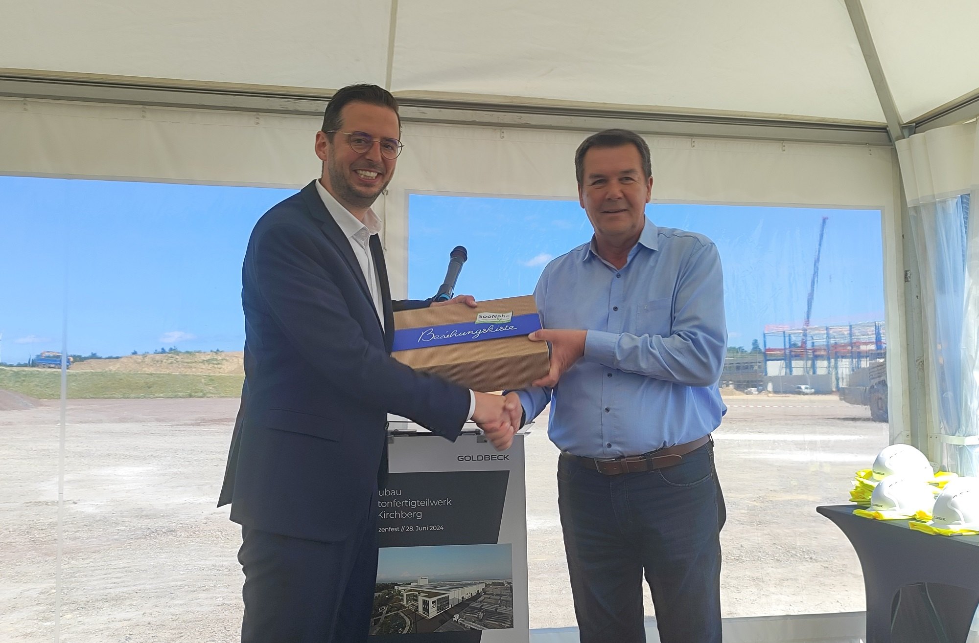 "Für alle Projektbeteiligten wird der Fortschritt jetzt wirklich greifbar", ergänzt Werksleiter Marco Molitor. "Das heutige Fest möchten wir nutzen, um allen Projektbeteiligten zu danken: unseren Partnern hier in der Region und unseren Kolleginnen und Kollegen bei Goldbeck." Kirchbergs Bürgermeister Werner Wöllstein betonte: "Von Anfang an hat die Chemie gestimmt. Die Stadt ist stolz, dass sich die Firma Goldbeck hier ansiedelt." Dem stimmte VG-Bürgermeister Peter Müller zu und ergänzte: "Das Stützenfest ist ein tolles Beispiel für die Weichenstellung für eine prosperierende Wirtschaft in Kirchberg sowie eine lebenswerte Zukunft."