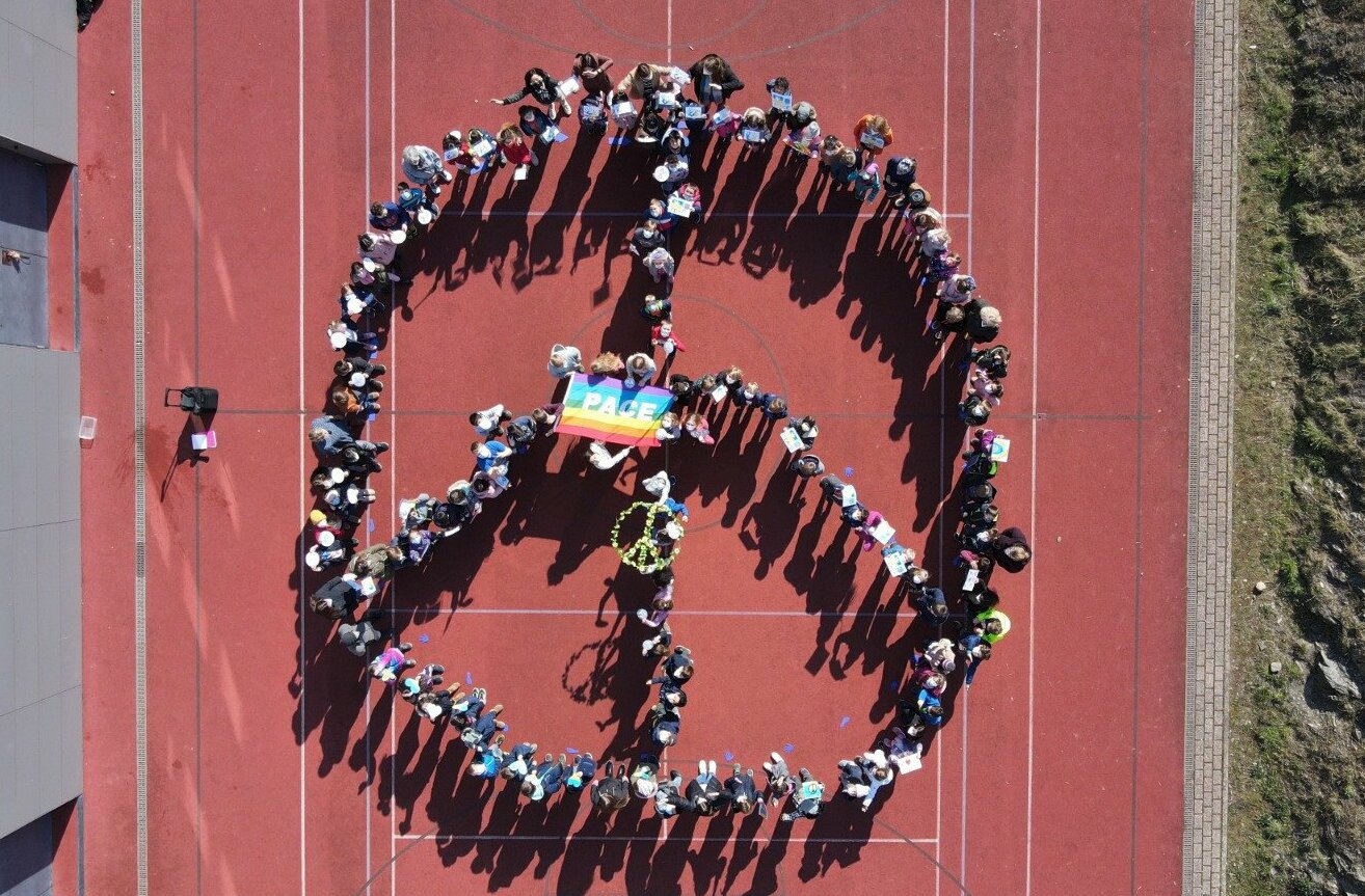 So möchte die Grundschule Bad Salzig all ihre guten Wünsche und positiven Gedanken in diesen schwierigen Zeiten hinaus in die Welt tragen. Nach dem Singen des sehr passenden Schulliedes "Hand in Hand", positionierte sich die gesamte Schulgemeinschaft als großes Peace-Zeichen - für alle ein sehr bewegendes Erlebnis.