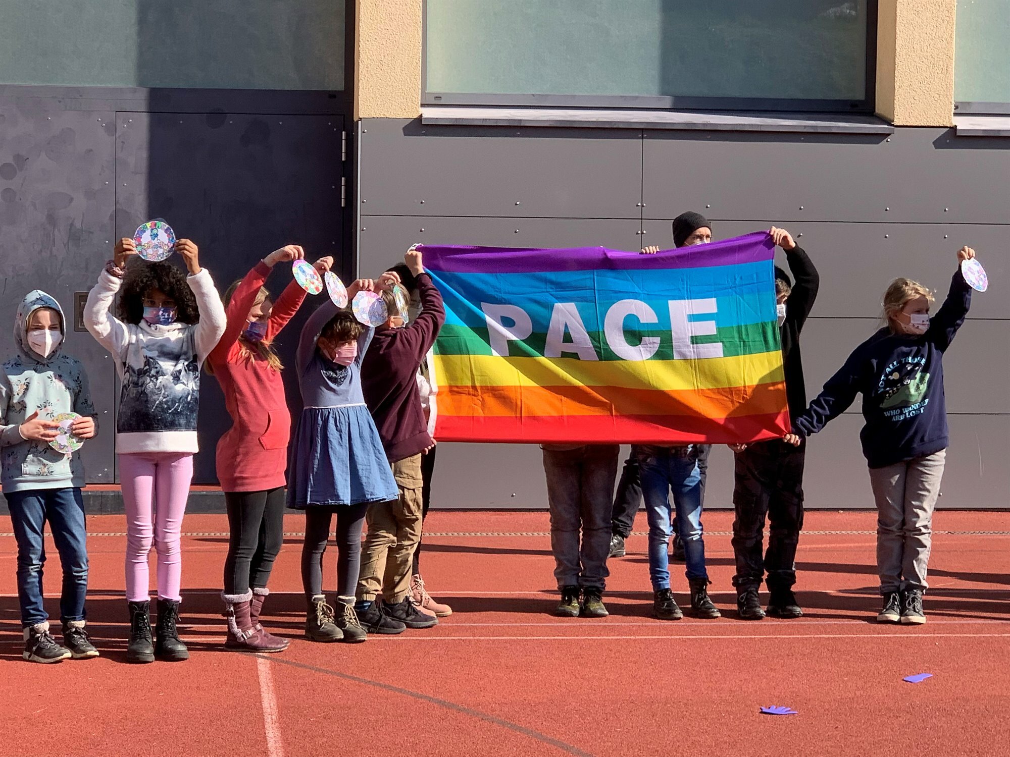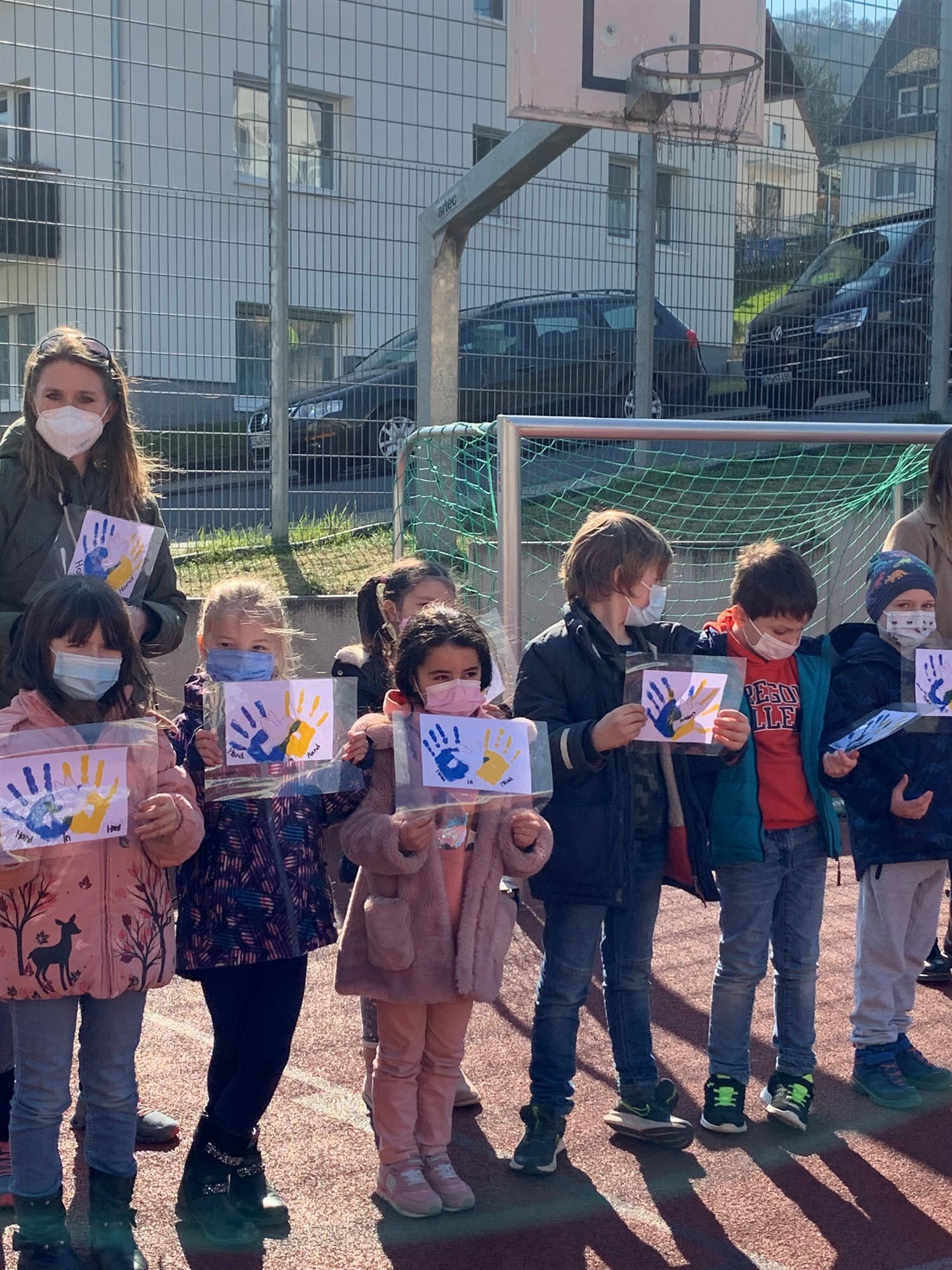Verschiedenste kleine Kunstwerke zum Thema Frieden waren im Unterricht entstanden: Friedenstauben, sich reichende Hände, bunte Peacezeichen, gute Wünsche, gelb-blaue Handabdrücke und Herzen und mehr. Diese werden nun am Bauzaun auf dem Schulhof aufgehangen, sodass sich dieser zu einem "Band des Friedens" entwickelt.