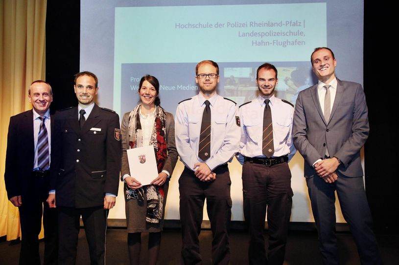 Den Preis nahmen Verantwortliche und Mitglieder des Projektes von Staatsminister Prof. Dr. Konrad Wolf entgegen. An dem Festakt im Mainzer Gutenbergmuseum nahmen unter anderem auch Ministerialdirigent Joachim Laux und die Leitung der Hochschule der Polizei, Direktor Friedel Durben und Dr. Axel Henrichs teil.