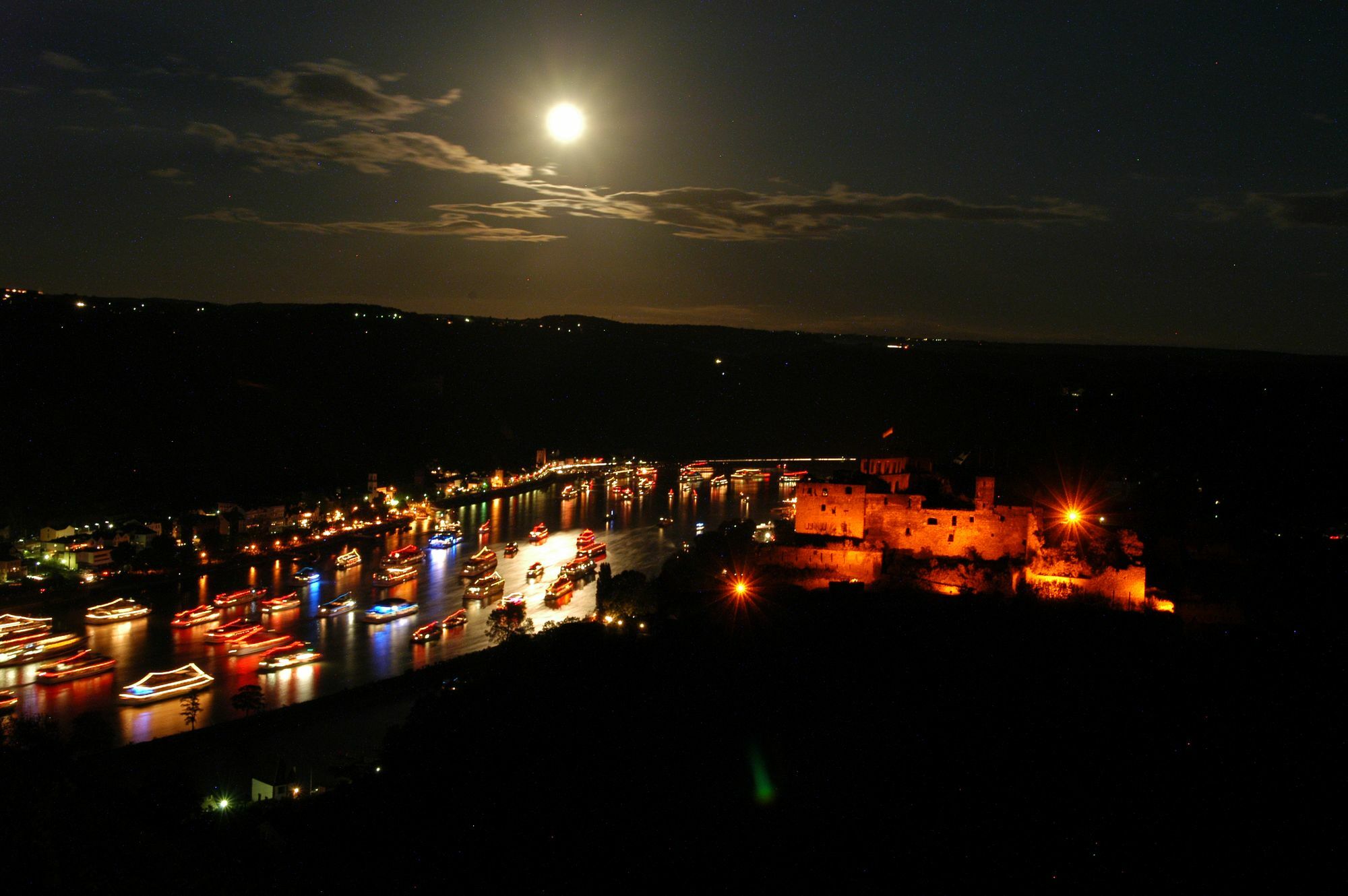 21.00 Uhr Signalschüsse, Bengalische Beleuchtung der Burgen, Städte und Höhen; anschl. Feuerwerk von der Burg Katz, Burg Rheinfels und aus der Mitte des Rheins