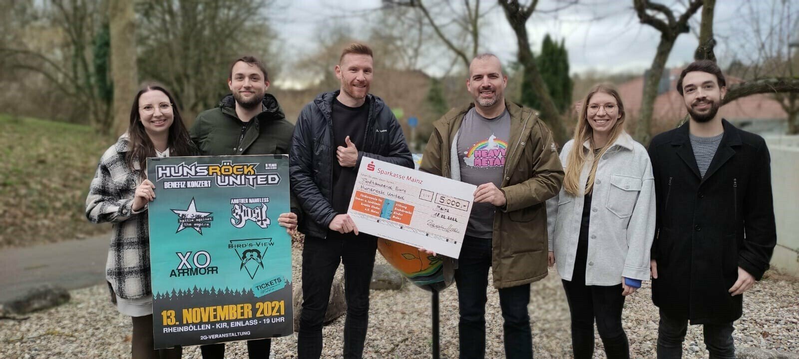 Am 13. November 2021 fand im KiR in Rheinböllen das Benefizkonzert "Hunsröck United" unter entsprechenden Corona-Auflagen statt. Das Konzert wird seit vielen Jahren ehrenamtlich vom Verein organisiert und durchgeführt. Vorstand Kai Leimig (v.v.l.) bedankte sich für die stolze Summe und die jahrelange Treue und lobte das Engagement von Hunsröck United.