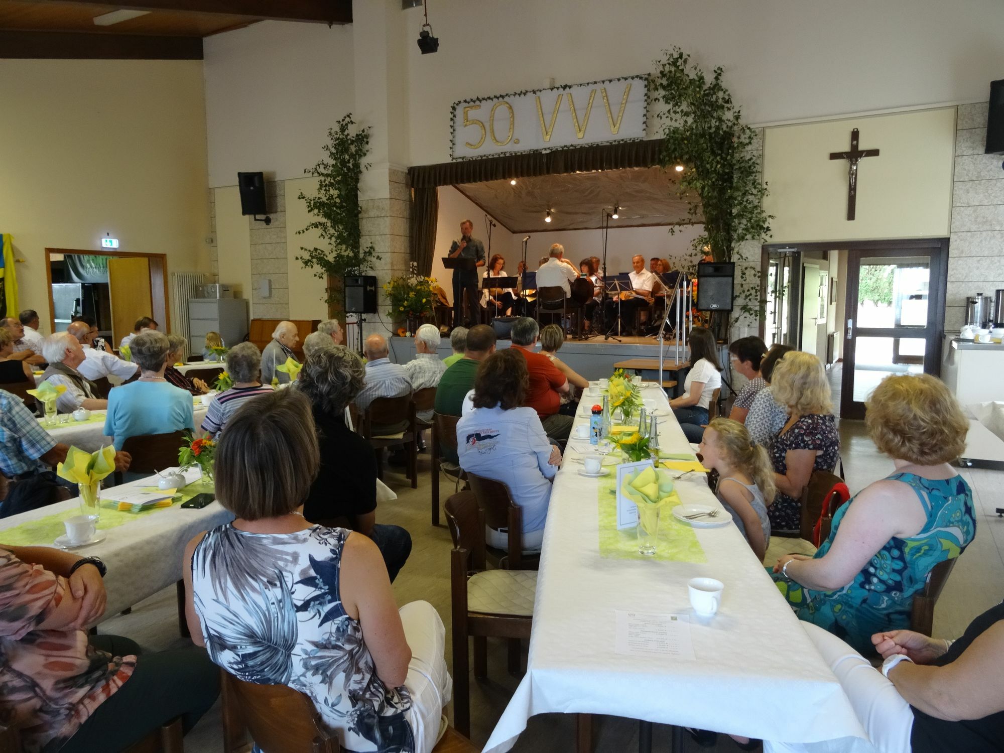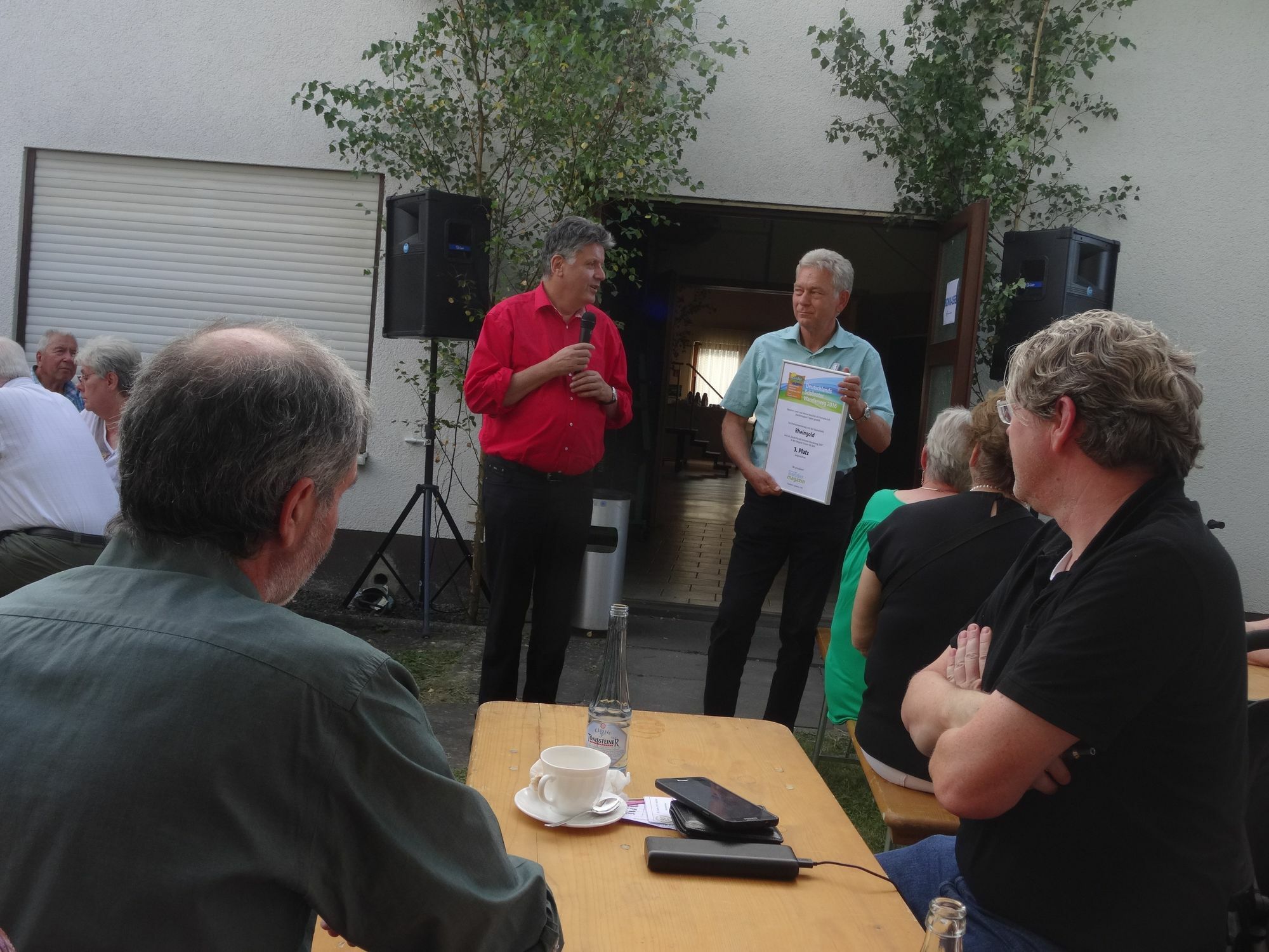 In seiner Festansprache erinnerte der Vorsitzende an die Anfänge des Vereins, als beim Anlegen und Freischneiden der Spazier- und Wanderwege noch mit Sense, Sichel und Heeb gearbeitet wurde. Und dies vorwiegend an Sonntagen, da der Samstag damals noch ein normaler Arbeitstag war. Motorgeräte konnten erst Anfang der 1980er Jahre angeschafft werden. Zu erwähnen sind auch die zahlreichen Projekte, die der Verein zur Verschönerung des Ortsbildes sowie zur Förderung des Wandertourismus geleistet hat. Hierzu zählt der Oberbornbrunnen genauso wie das Wartehäuschen an der Bushaltestelle oder die Stützmauer in der Holzfelder Ringstraße und die Anlage von Blumenrabatten. An die Blumenschmuckwettbewerbe erinnern noch heute die Plaketten an den mit Preisen ausgezeichneten Wohnhäusern in Holzfeld. Die Ziele des Vereins sind heute grundsätzlich die gleichen wie damals, allerdings mit aktueller Schwerpunktsetzung. Der VVV-Holzfeld organisiert den Umwelttag der Stadt Boppard im Ortsbezirk und hält die Spazier- und Wanderwege von Aufwuchs und Gestrüpp frei und begehbar. Die aktiven Mitglieder sorgen auch für die zahlreichen Sitzgelegenheiten, die entlang der Wege zu einer Rast einladen. Die traditionelle Ausflugsfahrt im Sommer ist den Teilnehmern in genauso guter Erinnerung wie die jetzt schon seit vielen Jahren stattfindende Herbstwanderung mit anschließendem Helferfest. Nicht unerwähnt bleiben darf die Fahrt zu einem Weihnachtsmarkt in der Umgebung, die jedes Jahr in der Vorweihnachtszeit regen Zuspruch findet. Bei der Ehrung der Jubilare konnte außer der 40-jährigen Vereinszugehörigkeit erstmals auch die 50-jährige Mitgliedschaft im VVV-Holzfeld mit einer Urkunde und einem Weinpräsent sowie mit den Glückwünschen des Vorstandes bedacht werden. Bei dieser Gelegenheit verwies auch Rudi Schulz als Gründungs- und Ehrenmitglied auf die Verdienste des Vereins und äußerte seine Zuversicht für die weitere Zukunft. Der Bürgermeister der Stadt Boppard, Dr. Walter Bersch, und der Vorsteher des Ortsbezirks Holzfeld, Werner Karbach, besuchten die Feier zum anschließenden gemütlichen Beisammensein. Sie präsentierten die zuvor vom Deutschen Wanderinstitut überreichte Urkunde zum dritten Platz der „Traumschleife Rheingold“ bei der Wahl „Deutschlands schönster Wanderweg“ in der Kategorie „Touren“. In ihren Grußworten betonten beide die Notwendigkeit der Arbeit des VVV-Holzfeld und insbesondere den Beitrag zur Pflege unserer „Traumschleife“.
