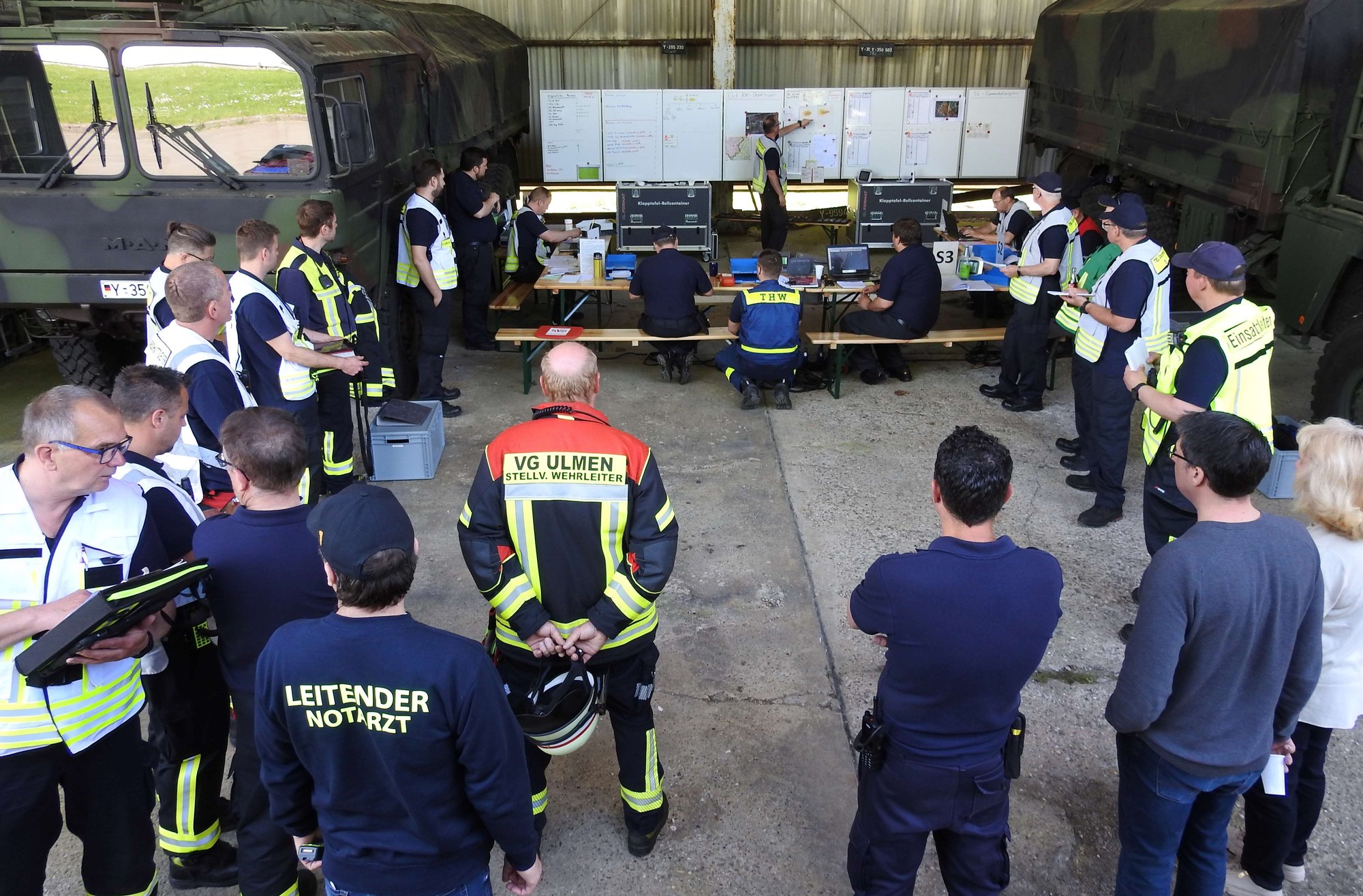 Im rückwärtigen Bereich galt es für die Führungsstaffel und die Technische Einsatzleitung den Einsatzleiter Markus Morsch (Brand- und Katastrophenschutzinspekteur Cochem-Zell) bei dieser komplexen Übung zu unterstützen. Dabei mussten unter anderem die örtlichen Kräfte koordiniert, weitere Kräfte alarmiert und der Einsatz dokumentiert werden. Ein wichtiger Bestandteil war die Bestimmung der Gefahrstoffe mit den hieraus entstehenden Gefahren. In Zusammenarbeit mit dem Deutschen Wetterdienst wurde auch eine mögliche Ausbreitung berechnet und folglich weitere angenommene Maßnahmen wie die Warnung der Bevölkerung über Warnapps, Radiomeldungen und Durchsagen veranlasst. Organisiert und vorbereitet wurde diese umfangreiche Übung von Lukas Weis, dem stellvertretenden Leiter des Gefahrstoffzuges Cochem-Zell.