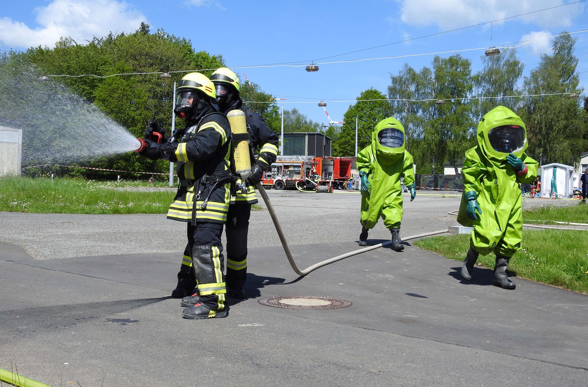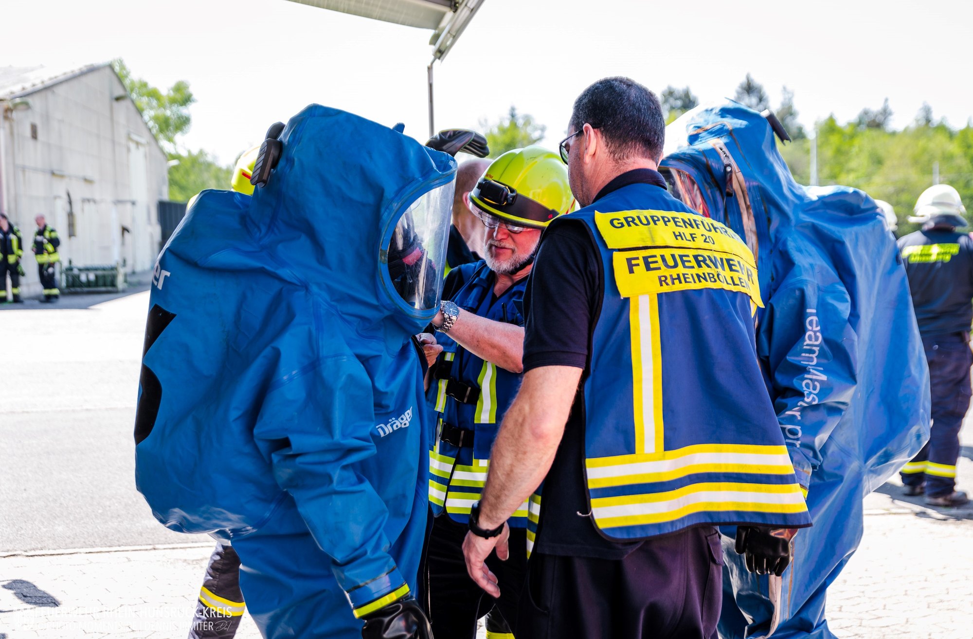 Im weiteren Verlauf galt es, die beim Unfall beschädigten Behälter mit speziellen Werkzeugen abzudichten und so die Situation einzufrieren und eine Ausbreitung zu verhindern. Im unmittelbaren Gefahrenbereich mussten die Rettungskräfte diese Tätigkeiten bei sommerlichen Temperaturen in sogenannten Chemikalienschutzanzügen (CSA) durchführen. Dies sind schwere Vollschutzanzüge aus Gummi, unter denen die Feuerwehrmänner- und Frauen komplett von den Umweltbedingungen abgeschirmt sind und so sicher arbeiten können - eine schweißtreibende und anstrengende Arbeit! Um die gefährlichen Stoffe nicht zu verschleppen und dabei auch weitere Einsatzkräfte nicht zu gefährden mussten die Kameradinnen und Kameraden nach getaner Arbeit im Gefahrenbereich in einer extra aufgebauten Dekontaminationsstrecke gereinigt werden, um anschließend die CSA sicher ablegen zu können.