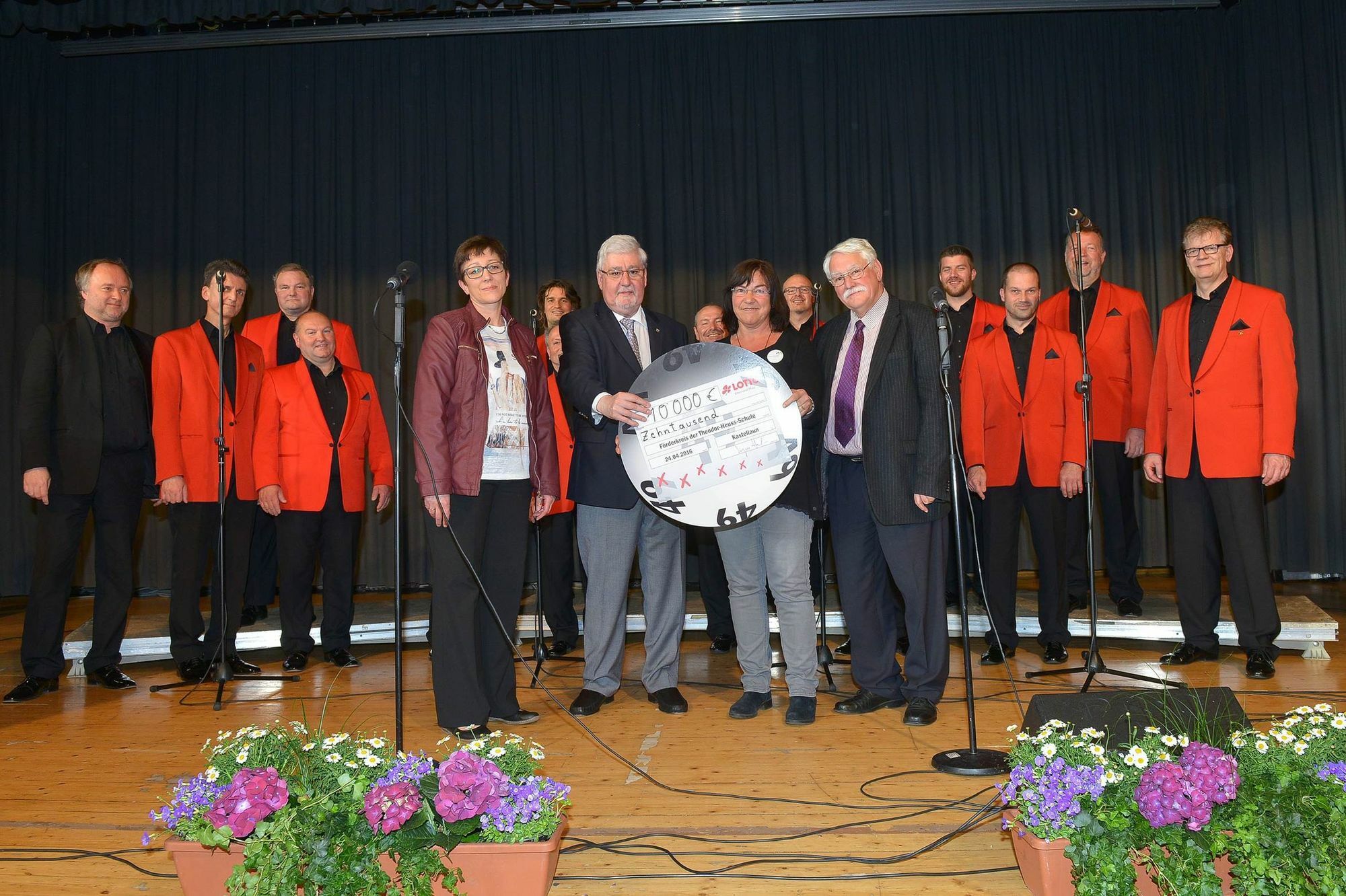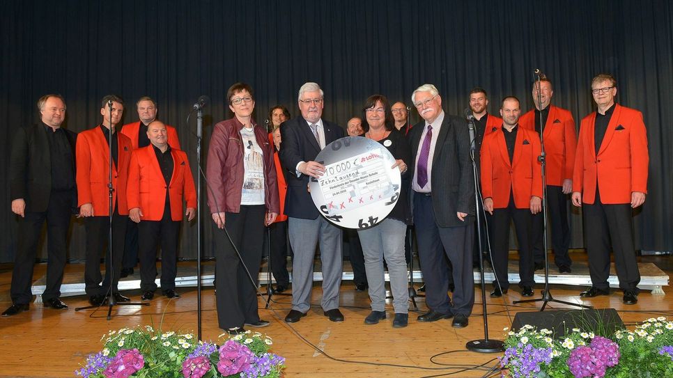 Immer wieder stellt sich der weltbekannte Chor aus Mainz bei seinen Konzerten in den Dienst der guten Sache und hat so mit Unterstützung von Lotto Rheinland-Pfalz seit 2007 bereits mehr als eine Million Euro an Spenden »ersungen«. Beim Gastspiel in Kastellaun kamen in der vergangenen Woche noch einmal 10 000 Euro hinzu - diesmal für den Förderkreis der Theodor-Heuss-Förderschule, dem WochenSpiegel-Medienpatenkind. Joachim Mertes, Schirmherr des Konzertes im Tivoli, und Lotto-Stiftungs-Vorstand Walter Desch überreichten den symbolischen Spendenscheck an Anke Schnorr, Vorsitzende des Förderkreises der Theodor-Heuss-Schule, und Andrea Günster als Vertreterin der Schulleitung. Die Spendensumme soll nun in die Anschaffung einer Rollstuhl-Schaukel und eines Rolli-Trampolins fließen. Info: www.ths-kastellaun.de