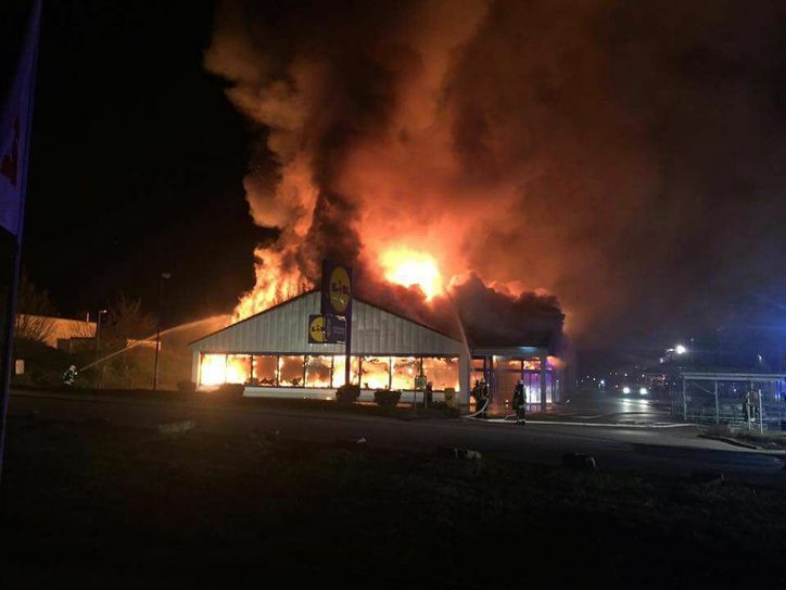 Gegen 21.30 Uhr ging die Meldung bei der Polizei in Simmern ein: Der Lidl-Supermarkt in Kastellaun steht lichterloh in Flammen. Bis zu 145 Feuerwehrleute aus der Verbandsgemeinde Kastellaun und von benachbarten Wehren versuchten bis in die frühen Morgenstunden hinein, das Feuer unter Kontrolle zu bringen. Sie konnten jedoch nicht verhindern, dass Gebäude vollkommen zerstört wurde.