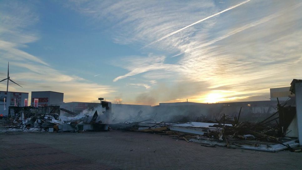 Wo gestern noch ein Supermarkt stand, befindet sich heute Morgen nur noch ein rauchendes Meer aus Trümmern: Der Lidl-Supermarkt in der Kastellauner Fordstraße wurde heute Nacht ein Raub der Flammen. Die Ermittlungen zur Brandursache dauern noch an.