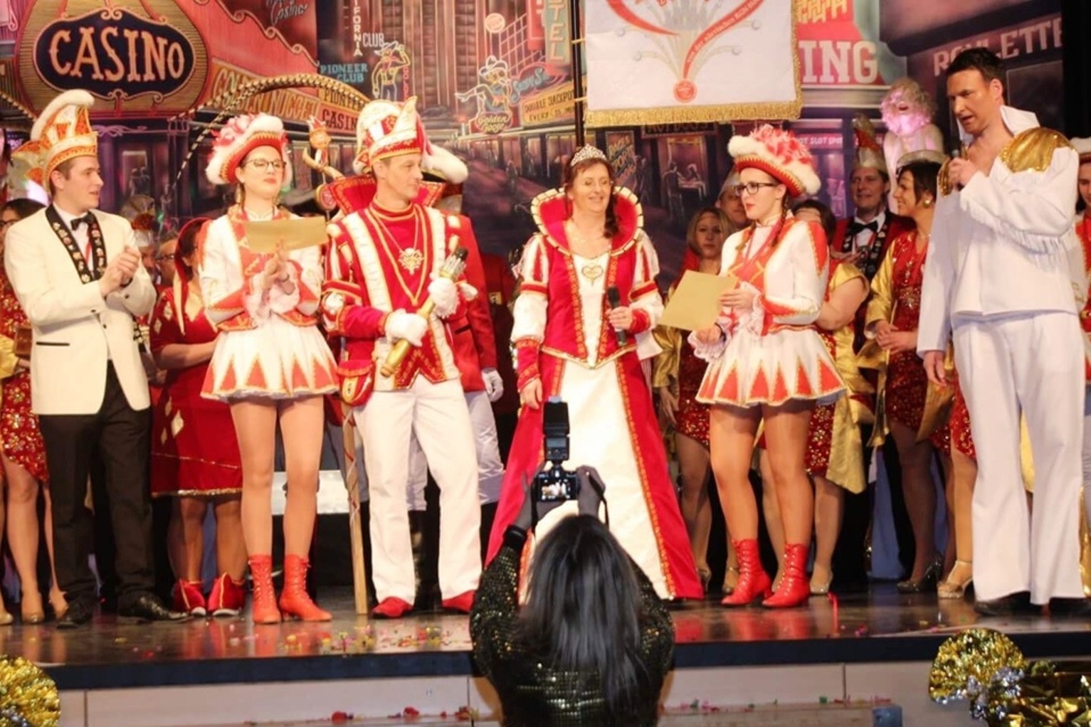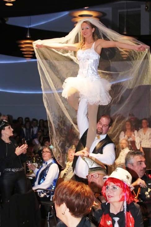 Bernd Schröder und sein Sohn Sebastian wurden vom RKK vertreten durch Claudia Peter Verdienstmedaillen für langjährige Unterstützung des Karneval verliehen. Pünktlich um 19:33 Uhr zog ein einzelner Elferratstänzer durch den Gang und lenkte die Blicke in Richtung Bühne, wo sogleich seine Kollegen mit Frack und Melone ihre Tanzeinlage starteten. Unter dem Frack kamen dann elf ELVIS-Double zum Vorschein. Passend zum Motto „Baudobriga lädt ein – zur Las Vegas Show am Rhein“ legten die elf Jungs tollen Tanz mit gekonnten Hebefiguren auf´s Parkett. Sitzungspräsident Philipp Schug freute sich, das er neben Prinz Marco I. & Prinzessin Tanja I. von der närrischen KGN-Hochburg auch alle Bopparder Karnevalsvereine begrüßen konnte. Erfolgreiche Jugendarbeit zeigt sich am Bild der Stippeföttchen, die mit 29 Kindern die Bühne füllten. Der erster Redebeitrag handelte von „Bauer sucht Frau“. Hier probte Karl und Pitter (Fred Werner und Michale Günster) den Besuch der auserwählten unter den Augen von RTL. Las Vegas heißt Magie und so nannte die von Julia Pütz, Nikola Engel & Carina Groß trainierte Jugendshowtanzgruppe ihre gelungene Darbietung „Magic Dance“. Als nächstes begrüßte dann der Rheinbayer, Frank Mallmann nach zweijähriger Pause sein Publikum. Neu umgeschult als Masseur berichtete von starkem Applaus begleitet, sehr bildlich beschrieben von der Massage von voluminösen Körpern. Einen Wechsel gab es beim klassischen Funkentanz. Tobias Kreuz als neuer Kommandant, hatte diese Funktion von Klaus Schneider übernommen. Wie im letzten Jahr ist auch jetzt wieder der schwäbische Landbote (Jürgen Kunz) aus der Nähe von Stuttgart angereist. Danach begeisterte die Jugendgarde - bei denen einige aus den Stippeföttchen hervorgegangen sind - mit einem tollen Auftritt. Die Bopparder Goldstückcher waren wieder ein Augenschmaus, auch durch zwei Gasttänzer für die Damen. Graziös räkelten sich die Goldstückcher sich unter tosendem Beifall auf den berühmten Thonet Stühlen (Trainerin Sarah Rohte). In Las Vegas abgeworben für den Auftritt in Boppard wurde ein orientalischer Bauchtanz (Otto May & Klaus Jablonski) mit Sultan (Phillip Kunz) der sich im Laufe des Auftritts in DJ Ötzi verwandelte. Solomariechen und fetzige Musik schließen sich nicht aus. Das bewies Nikola Engel (trainiert von Alicia Knebel, Michele Weiler & Anna Rimmler) in einer hervorragenden Tanzdarbietung zu „Highway to hell“ und „I was made for loving you“. Andrea Mallmann kam als „Eine geplagte Frau“ in die Bütt . Dann war es Zeit für die DREI TENÖRE (J. Brockamp, B. Schröder und R. Bach).Dann betrat ein Halbgott in Weiß die Bühne. Der Doktor aus Mayen (Werner Blasweiler) schaffte es zu später Stunde das Publikum mit Geschichten von Adam im Paradies in seinen Bann zu ziehen. Last but not least – der Auftritt der Showtanzgruppe. Las Vegas, die Stadt in der Hochzeitsträume wahr werden. Der Einmarsch mit einer hoch schwebenden Braut und passende Hebefiguren auf der Bühne, da war den Trainerinnen Victoria Engel & Carola Gras wieder einiges sehr gut gelungen. Zum Finale wurden dann noch drei Kostüme aus dem Publikum prämiert. Anschließend wurde noch bis in den Morgen bei Live-Musik getanzt.