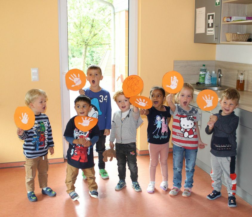 Die Kinder stellen fest, dass es gar nicht so einfach ist, in einer ungewohnten Situation zu einem Fremden „Nein“ zu sagen. Deswegen übten sie gemeinsam mit ihrer Erzieherin diesen Ausruf. Zu Beginn klang er noch sehr leise und zögerlich, doch mit jedem Mal ertönte das „Nein“ oder „Stopp“ lauter und stärker. Die Jungen und Mädchen stellten sich selbstbewusst auf und keiner konnte mehr daran zweifeln, dass ihre Worte und ihre Meinung nicht gehört wird. Um diesen Ausdruck zu verstärken, bastelten alle Kinder ein „Stopp“-Schild. Jeder schnitt einen Kreis aus Pappe aus, personalisierte diesen mit seinem Handabdruck und die Erzieherin unterstütze ihre Gruppe, in dem sie auf jedes Schild das Wort „Stopp“ schrieb.