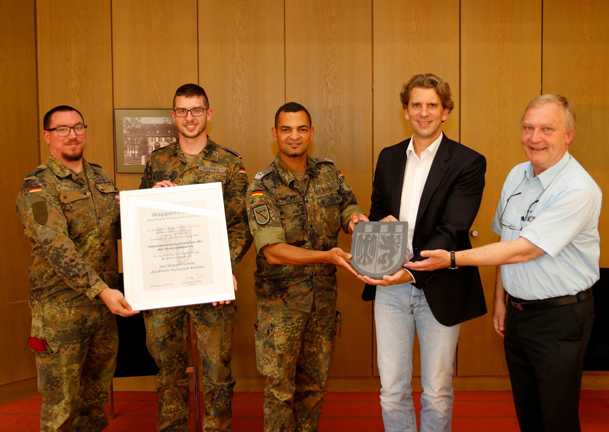 Landrat Dr. Bröhr: „Bei der wichtigen Aufgabe der Kontaktnachverfolgung infizierter Personen unterstützte die Bundeswehr in noch nie dagewesenem Maße das Personal unseres Gesundheitsamtes. Nur so war es uns überhaupt möglich, dieses wesentliche Instrument zur Unterbrechung von Infektionsketten noch zu bewältigen.“ Daneben unterstützte die Bundeswehr auch personell in der Hunsrück-Klinik, der Teststation am Flughafen Hahn, sowie den Senioreneinrichtungen Haus Ursula in Gemünden, den Seniorenzentren in Kastellaun, St. Hildegard in Emmelshausen, Haus Elisabeth in Boppard, Haus Michael in Kirchberg und dem Puricellistift in Rheinböllen. Insgesamt summierte sich die Hilfe durch die Bundeswehr auf knapp 40 000 Einsatzstunden. Zum 31. Juli lief die personelle Unterstützung durch die Soldatinnen und Soldaten der Bundeswehr in unserem Landkreis aus. Als Dankeschön verleiht Landrat Dr. Bröhr das Wappenschild des Rhein-Hunsrück-Kreises mit der Widmung: „Im Namen der Bürgerinnen und Bürger des Rhein-Hunsrück-Kreises verleihe ich in tiefer Dankbarkeit und Anerkennung dem Informationstechnikbataillon 282 der Hunsrückkaserne für die Hilfe bei der Eindämmung der Corona-Pandemie das Wappenschild des Rhein-Hunsrück-Kreises.“ „Wir haben gerne geholfen und würden das jederzeit wieder tun.“ bedankt sich der Kommandeur des Informationstechnikbataillons 282 Kastellaun, Herr Oberstleutnant Anthony James Buford.