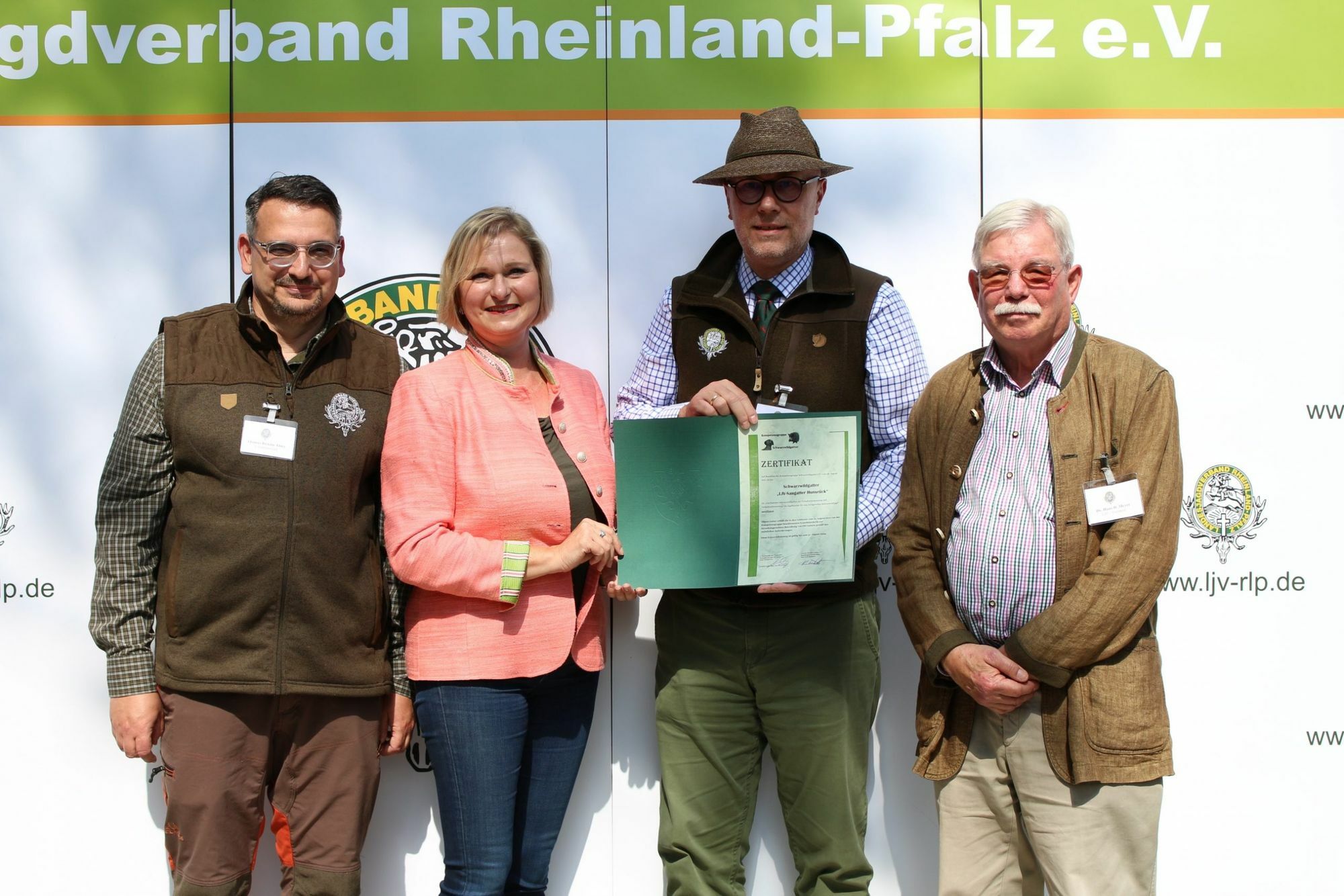 „Unser LJV-Saugatter Hunsrück reiht sich somit als zwanzigstes Gatter in die Liste der bundesweit existierenden Einrichtungen dieser Art ein. Diese Gatter werden nach den Vorgaben der Kompetenzgruppe Schwarzwildgatter e.V. errichtet und tierschutzgerecht betrieben", so Mahr. Er bedankte sich beim rheinland-pfälzischen Umweltministerium für die Unterstützung beim Erwerb des Geländes und beim Bau der Anlage. Insgesamt hatte das Ministerium eine Gesamtförderung von rund 500 000 Euro aus Mitteln der Jagdabgabe für das rund acht Hektar große LJV-Saugatter Hunsrück bewilligt. Das LJV-Saugatter Hunsrück befindet sich in der Umgebung von Kastellaun. Dort werden derzeit sieben Wildschweine auf ihre zukünftige Arbeit vorbereitet. LJV-Vorstandsmitglied Dr. Hans Detlef Meyer, der als Projektleiter insbesondere für die Errichtung der neuen Anlage verantwortlich war, lobte während der Einweihungsfeier das besondere Engagement des Gatter-Teams und übergab die Ernennungsurkunden als Gattermeister an Thomas Ricklin-Thiry (1. Gattermeister), Christian Meyer (2. Gattermeister) und Bernhard Haus (Gattermeister). Dr. Christina Jehle von der Kompetenzgruppe Schwarzwildgatter e.V. übergab das Zertifikat als anerkanntes Schwarzwildgatter zur Verhaltensanpassung und Verhaltensbewertung von Jagdhunden für eine waidgerechte Schwarzwildjagd an LJV-Präsident Mahr, LJV-Vorstandsmitglied Dr. Meyer und das Gattermeister-Team Ricklin-Thiry und Meyer. Josef Kinnen vom Orden „Silberner Bruch“ sprach in seinem Grußwort über die Bedeutung einer waidgerechten Jagd – insbesondere beim Schwarzwild – und übergab einen Koffer und Materialien zur Behandlung von veterinärmedizinischen Notfällen an das Gattermeister-Team – verbunden mit der Hoffnung, den Koffer und dessen Inhalt möglichst nie ernsthaft benutzen zu müssen. Auch wenn das LJV-Saugatter Hunsrück nun offiziell eingeweiht ist, finden derzeit noch keine Übungsstunden statt. Der eigentliche Betrieb wird im Frühjahr 2022 starten.