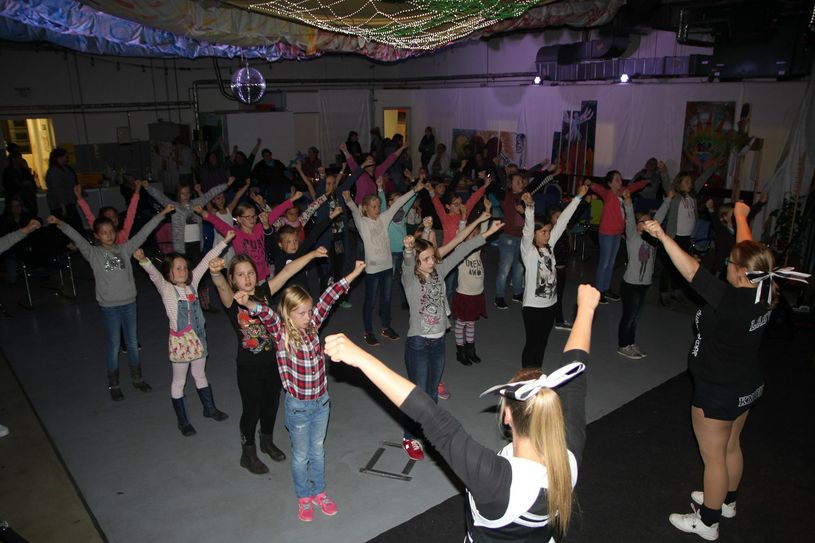 Immer mal wieder fand zum Abschluss der Workshop-Woche ein Fest statt, zum ersten Mal jedoch im Crossport to Heaven. Mit seinen unterschiedlichen Räumen und der ehemaligen Fertigungshalle bot das Gebäude auf dem Flughafen Hahn Platz für Workshops, Essen und Trinken und zum Tanzen. Mädchen aus dem Jonglage-Workshop zeigten ihr Können und begeisterten die Gäste zum Ausprobieren. Hille Arnold hatte Tipps und Tricks einer Djane an Mädchen veraten, die mit ihrer Musikauswahl und Tanzspielen die fröhlichen Besucherinnen begeisterten. Die Lady Knights, Cheerleader des 1.AFC Hunsrück Black Knight, überraschten mit einem besonderen Kennenlernprogramm den möglichen Nachwuchs. Den Abend über konnten Buttons, Luftballonfiguren und kleine Kunstwerke mit Lightpainting hergestellt werden. Für die Verpflegung sorgten zahlreiche ehren- und hauptamtliche Hände. Besonderen Genuss boten die frisch gezauberten Cocktails und selbstgebackenes süßes Fastfood. Seit über 20 Jahren führt das Netzwerk unterschiedlichster Frauen aus Einrichtungen, Verbänden, Vereinen und der Kreisjugendförderung zu einem umfangreichen Programm für Mädchen in den Herbstferien. Ohne das ehrenamtliche Engagement von vielen Frauen wären allerdings weder die Workshops noch das Abschlussfest möglich.