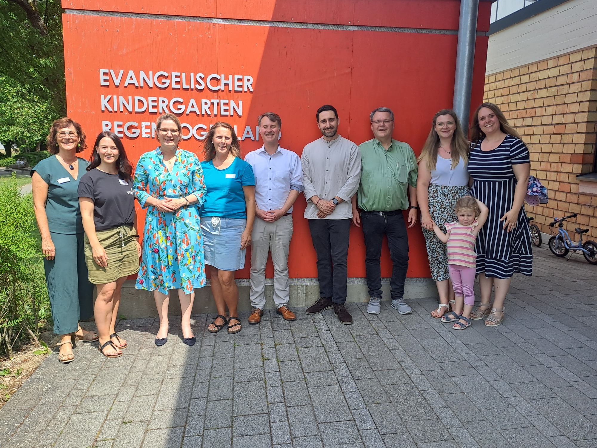Am Montag, 26.06.2023, besuchte die Bildungsministerin von Rheinland-Pfalz, Frau Dr. Stefanie Hubig, die Kita Regenbogenland in Kastellaun. Neben dem Kita Personal, fieberten auch die Kinder dem Treffen mit der Bildungsministerin entgegen, denn ab dem Morgen des 26.06. waren die Parkplätze, direkt vor der Kita, mit einem roten Flatterband abgesperrt worden. Die Kinder waren sehr neugierig, wer denn auf den reservierten Parkplätzen parken würde und mit welchem Auto, aber am wichtigsten: Wie würde der Besuch wohl aussehen? So versammelten sich einige Kinder kurz vor der Ankunft der Bildungsministerin im Flur und hielten ganz gespannt an den Fenstern wache. Als Frau Dr. Hubig mit ihrem Pressesprecher ankam, wurde sie erstmal herzlich vom Kita-Team, sowie dem Vorstand des Kita-Trägers VEKIST und Mitgliedern des Elternausschusses begrüßt, bevor es in die Cafeteria ging. Hier aßen gerade einige Kinder zu Mittag und Frau Dr. Hubig war begeistert davon, wie selbstständig die Kinder sich am Buffet bedienten und hinterher das benutzte Geschirr auch wieder wegräumten. Auch die Gäste durften das Mittagessen probieren und den Kindern beim Essen Gesellschaft leisten. Hier erhielt die Bildungsministerin auch Einblicke und Informationen zum Konzept der Konsultationskita Regenbogenland „Mit Lust und Laune essen – Essenssituationen in Einrichtungen bewusst gestalten“. Nach dieser kleinen Stärkung wurde Frau Dr. Hubig erst vom Kitapersonal durch einige Räume geführt, bis die Kinder auch hier die Initiative ergriffen und dem Besuch die Räumlichkeiten aus der Kinderperspektive zeigten. Egal ob Turnhalle, Bastel-, Bau-, oder Rollenspielraum – Die Kinder hatten zu jedem Zimmer etwas zu erzählen und machten die Führung mit ihrer offenen und unbeschwerten Art zu einem echten Erlebnis. Auch von dem großzügigen Außengelände war Frau Dr. Hubig begeistert und beobachtete die Kinder beim Klettern, Rutschen und Buddeln. Bevor sich die Bildungsministerin verabschiedete, überreichte sie den Kindern noch die Ameisenhandpuppe ,,Fred" mit einem tollen Experimtenordner, um gemeinsam die Welt zu entdecken. Dafür gab es für Frau Dr. Hubig, neben einem begeisterten ,,Dankeschön", eine herzliche Umarmung von den Kindern. Im Abschlussgespräch war die Bildungsministerin voll des Lobes für das Konzept, das Personal und natürlich für die Kinder der Kita Regenbogenland und bedankte sich für die vielen interessanten Einblicke und Erfahrungen, die sie hier sammeln konnte.