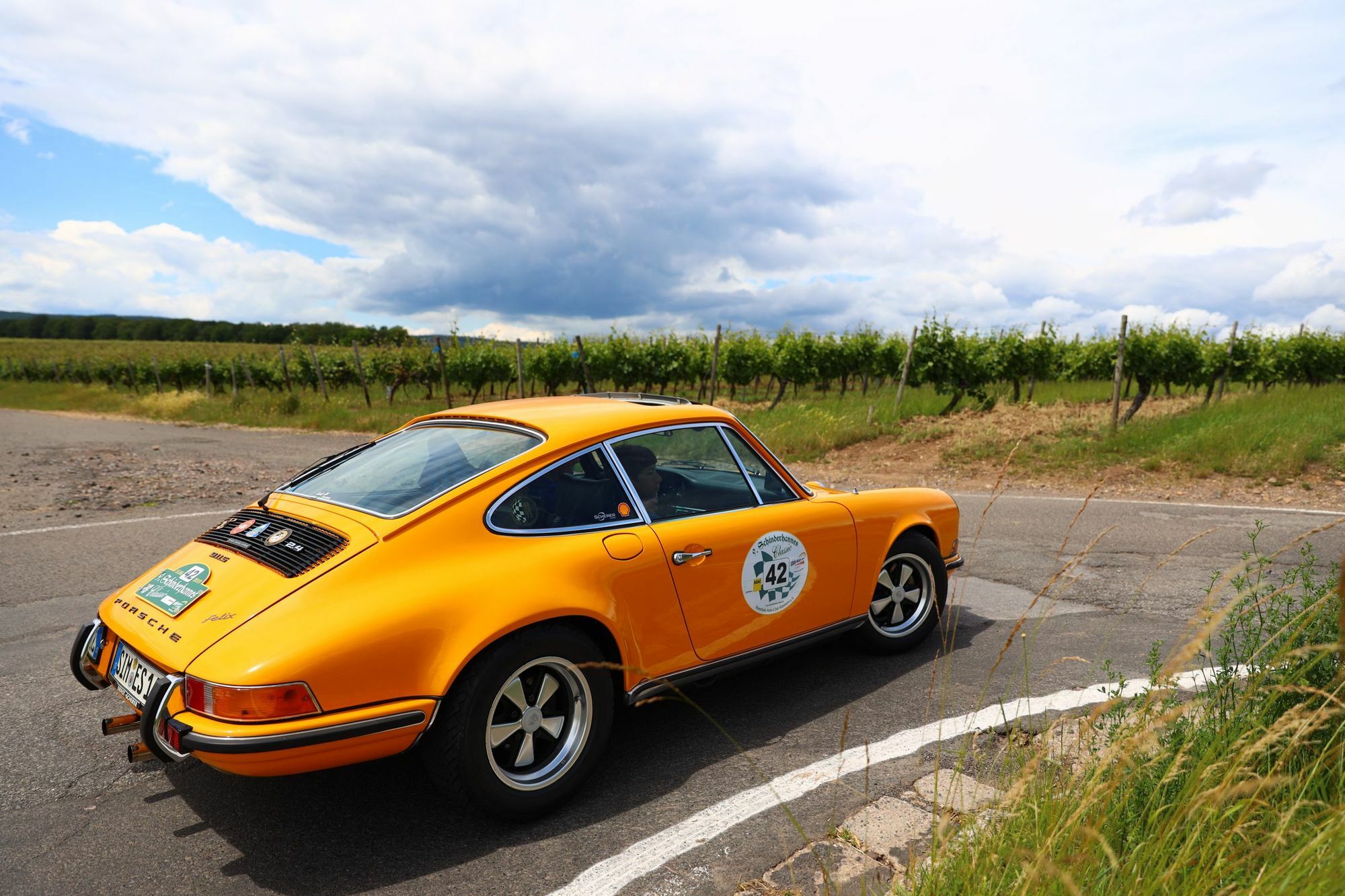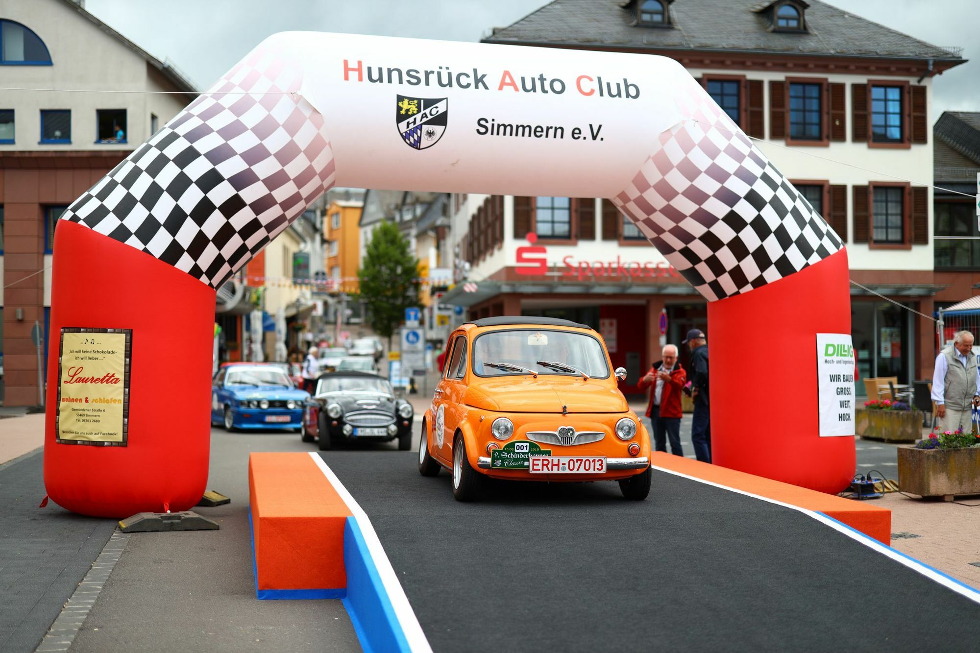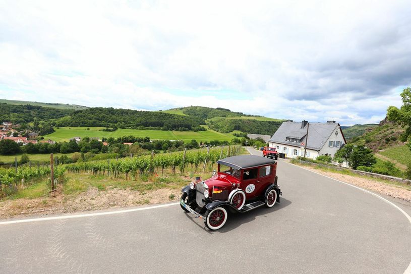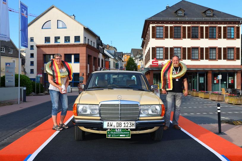 Der neue Startort in Simmern wurde wegen der Einbindung der Veranstaltung in die Reihe „Simmern-Automobil, wie das Auto den Hunsrück eroberte“ gewählt und kam sehr gut an. Viele der Teilnehmer bewunderten sofort die von der Firma Dillig errichtete schicke Startrampe auf der Schlossstraße. Nach Papierabnahme und Fahrerbesprechung ging es kurz vor 10 Uhr zum Start. Als erstes Fahrzeug durfte der Vorwagen mit der Nummer 001 auf die Rampe. Ein Stück Simmerner Rennsportgeschichte war an den früheren Heimatort zurückgekehrt. Der Steyr-Puch, eingesetzt von der Familie Trötzsch, der Ende der 60er Jahre von Dr. Musäus aus Simmern für Rennsportfurore sorgte, ging als erstes auf die Strecke. Im Minutentakt folgten ihnen die anderen Teams. Für die Unterhaltung der Zuschauer sorgte der Fachkundige Moderator Joachim Ebertz, der auch das Publikum wunderbar mit in die Vorstellung einband. Vorbei an der Nunkirche und durch Ravengiersburg galt es die Höhen des Soonwaldes zu erklimmen. Bei Simmertal änderte sich die Landschaft und es ging entlang der Nahe über Bad Sobernheim, Niederhausen, Waldböckelheim zur Mittagsrast nach Sponheim. Zwischendurch wurden die Teams in Meddersheim von der Soonwaldfee mit einem kleinen Weinpräsent von der Nahe begrüßt. Wie es sich für eine ordentliche Oldtimerrallye gehört, stand aber nicht nur das sehen und gesehen werden auf dem Programm. Zwischendurch musste die sportliche Startgruppe ein paar Wertungsprüfungen, bei denen es um gleichmäßige Fahrweise ging, absolvieren. Die Aufgaben der touristischen Starter lagen darin, entlang der Strecke markante Punkte zu entdecken und die dazu gehörigen Fragen zu beantworten. Frisch gestärkt vom Team des VFL Sponheim führte die Route über Wallhausen, Windesheim zurück in den Soonwald. Die Teilnehmer waren begeistert von den abwechslungsreichen Strecken. Nach den sonnigen, weinbestockten Hügeln der Nahe folgten nach nur wenigen Kilometern die schattigen Wälder des Soonwaldes. Bei Ellern wurde die Landschaft wieder offener und in einer Schleife durch typische Hunsrückdörfer ginge es zurück nach Simmern. Die ersten drei Plätze der sportlichen Ausfahrt gingen an: Stefan Fleck und Nele Fleck aus Lebach auf einem Alfa Romeo GTV 6, Martin Bonn und Rolf Pellini aus Mainz/Frankfurt auf Fiat 128 sowie Wolfgang Jung und Regine Jung aus Neunkirchen/Siegerland auf einem Opel Manta A. Die Platzierten in der touristischen Wertung: Ulf Wilke und Petra Niebuhr aus Remagen auf Mercedes 230, Andreas Wehlen und Bianca Wehlen aus Waldorf auf VW Golf 1 und Franz-Peter Gilles und Noel Schönberg aus Landkern auf Mercedes 220S Coupé.