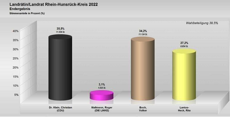 Die Kandidaten Dr. Christian Klein (CDU) und Volker Boch (unabhängig) konnten letztlich die meisten Wählerstimmen auf sich vereinigen. Laut dem vorläufigen Endergebnis liegt Klein dabei mit 35,5 Prozent der Stimmen nur hauchdünn vor Boch (34,16 Prozent). Damit ist auch klar: Rita Lanius-Heck (unabhängig) wird nicht die erste Frau an der Spitze des Landkreises. Sie erhielt 27,19 Prozent der Wählerstimmen und landete damit auf Platz drei. Der Kandidat der Linken, Roger Mallmenn, folgt abgeschlagen auf Platz vier mit 3,15 Prozent. Die Wahlbeteiligung lag bei 39,47 Prozent.