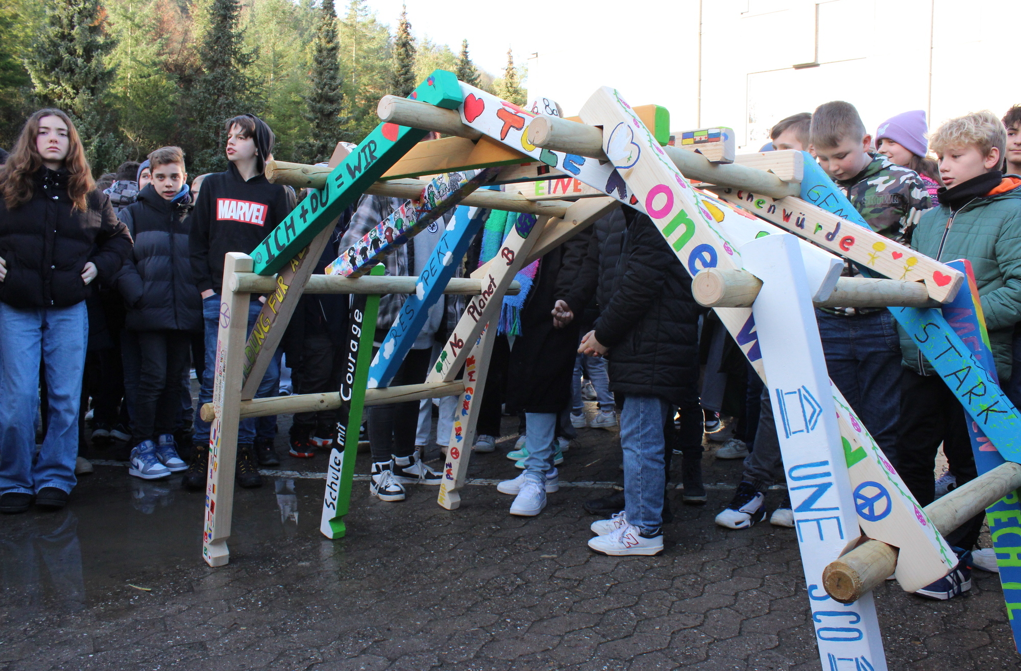 Symbolisch für diese Erkenntnis stand die gemeinsame Errichtung einer Friedensbrücke auf dem Schulhof. Knapp 400 Schüler waren dabei, als die Brücke aus einzelnen Holzbalken zusammengefügt wurde. Jede Klasse hatte dazu einen Balken farbig gestaltet und mit einem Begriff versehen, der diese Brücke des Friedens und Miteinanders tragfähig machen sollte: Mut - Toleranz - Menschenrechte - kein Rassismus - Offenheit - gemeinsamer Austausch - Liebe … Die Balken fügten sich nach einem ausgeklügelten Plan zusammen und - das war für viele Anwesende überraschend - die sogenannte Leonardo-Brücke hielt, gänzlich ohne Schrauben oder Nägel. Nachdem sich der erste mutige Lehrer von der Tragfähigkeit der Konstruktion überzeugt hatte, ließen es sich die Schüler nicht nehmen, fast allesamt über ihre Friedensbrücke zu gehen.