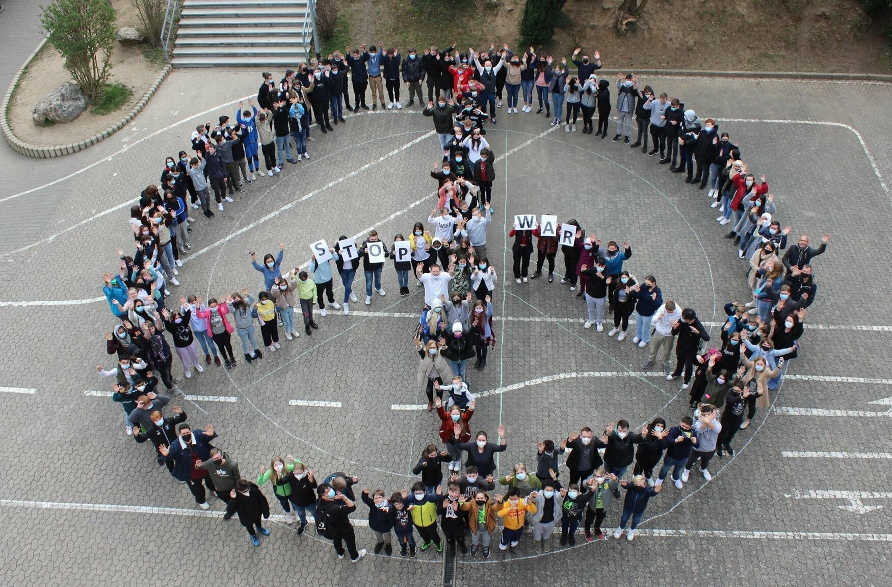 Die Nähe des Krieges, geografisch wie auch menschlich durch neue MitschülerInnen, die aus der Ukraine flüchten mussten, ermutigt gerade auch junge Menschen, Zeichen zu setzen. So senden Schüler*innen und Lehrer*innen aus Oberwesel ein Zeichen in die eigenen Köpfe und in die Köpfe der Menschen der ganzen Welt: Wir wollen Frieden – für alle Menschen unserer gemeinsamen Welt.