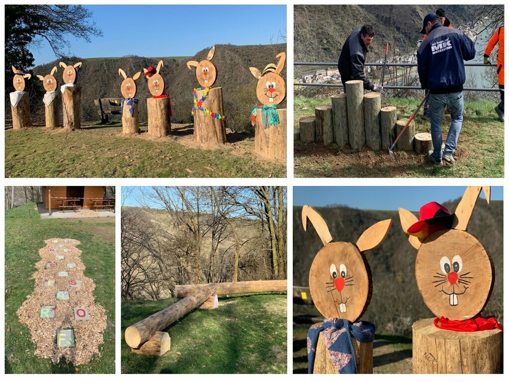 Ein besonderes, viel genutztes Highlight war der Fotopunkt. An einem herrlichen Aussichtspunkt an der Rheinkante gelegen, wurden acht XXL-Holz-Osterhasen aufgestellt und liebevoll ausstaffiert. Unzählige Fotos wurden dort gemacht und kaum einer, der vorbeikam, konnte sich dem Charme der Hasenbande entziehen. Als besonders originell kam es bei den Osterhasenjägern an, dass man den mit dem Smartphone gemachten Schnappschuss an eine angegebene Mobilnummer schicken konnte. Von dort aus wurde das Foto auf Papier gedruckt und am Start- bzw. Zielpunkt in den Schaukästen ausgestellt. Dort werden die Fotos noch eine kleine Weile bleiben und sicher manchen Vorbeigehenden erfreuen. Ebenso wird der Oster-Zoo am Dorfplatz weiterhin zu bestaunen sein, bevor der Käfergarten an einen anderen Platz umzieht. Wäre doch schade, wenn die von den Kindern gestalteten Krabbelkäfer kein neues Zuhause finden würden.