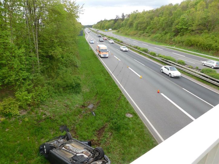 Ein dunkler PKW überholte am Freitagabend gegen 18.45 Uhr auf der A 61 in Fahrtrichtung Ludwigshafen mehrfach aggressiv sowohl links, als auch rechts und scherte dabei in einen viel zu geringen Sicherheitsabstand wieder ein. Im Bereich der Anschlussstelle Emmelshausen musste ein weiterer Fahrer deswegen stark bremsen. Dabei geriet sein Fahrzeug ins Schleudern, überschlug sich und endete im rechten Straßengraben.