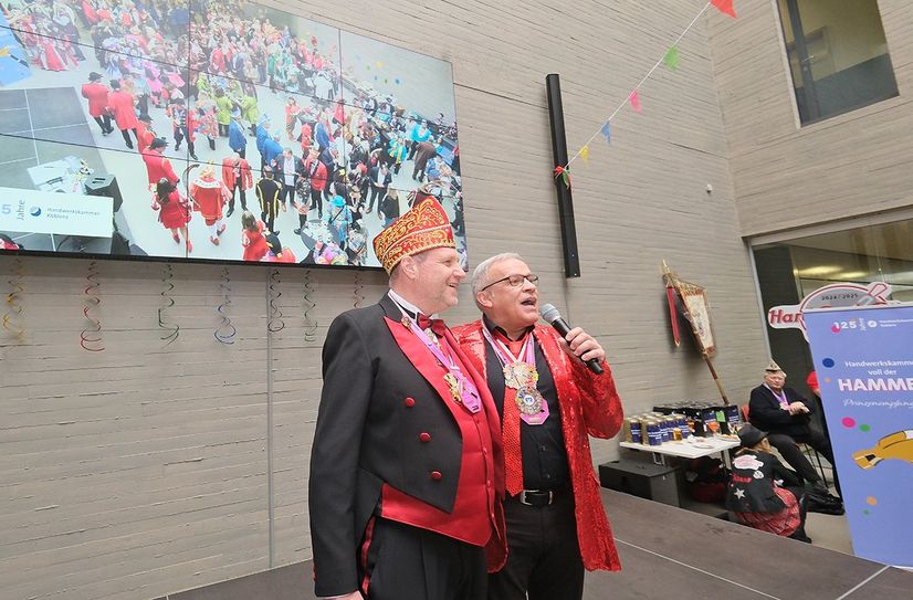 Andreas Münch, Präsident der Arbeitsgemeinschaft Koblenzer Karneval (AKK), führte mit Kurt Krautscheid höchst amüsant durch das Programm. Unterstützt wurden sie vom HwK-Hauptgeschäftsführer Ralf Hellrich, der kurzerhand zum „staatlich geprüften Ordensverteiler samt Gefolgschaft“ ernannt wurde und den hocherfreuten Gästen persönlich die aktuellen HwK-Orden verteilen durfte. Dieser Orden ist 2025 besonders farbenfroh gestaltet und weist mit seinem Spruch „Handwerkskammer - voll der Hammer!“ auf das 125-jährige Bestehen hin, das die HwK feiert. Glitzernde Edelsteine auf einer goldenen Landkarte markieren die HwK-Standorte im Kammerbezirk.