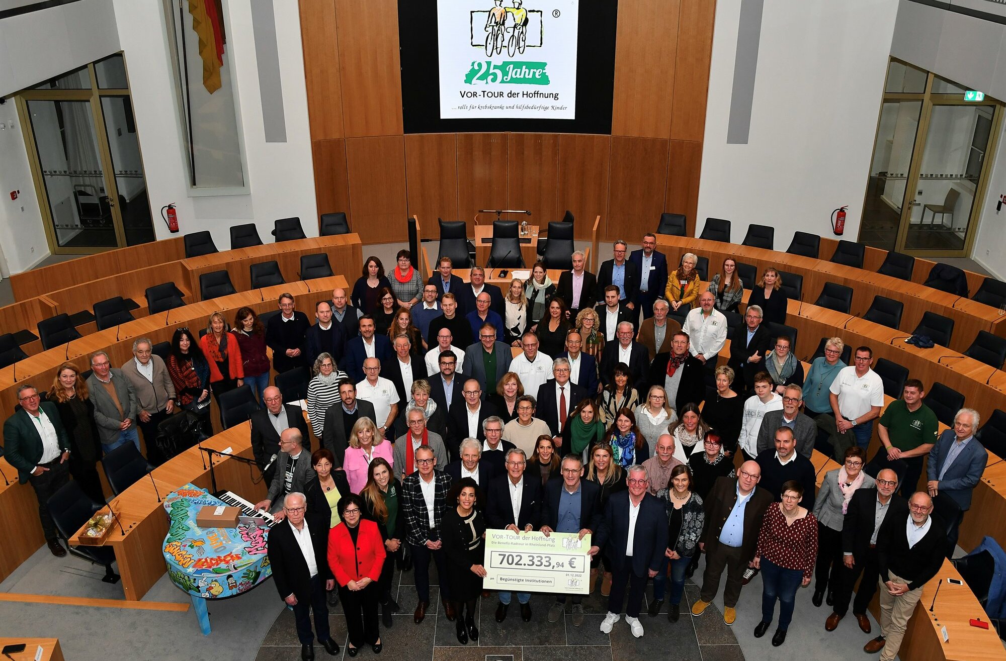 »Ich freue mich riesig über die 702 333,94 Euro an Spenden, die wir in diesem Jahr bei unserer 25. Auflage der Vor-Tour an den verschiedenen Etappenorten und bei zahlreichen Aktionen und Aktivitäten im ganzen Jahr eingesammelt haben«, sagte der Ehrenvorsitzende und Organisationsleiter der Tour, Jürgen Grünwald, bei der Spendenübergabe im rheinland-pfälzischen Landtag.
