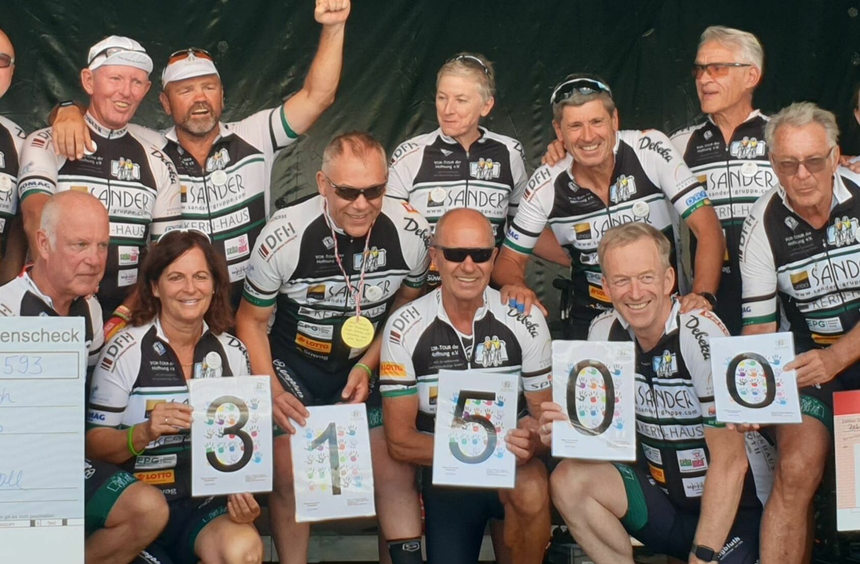 Weitere Beispiele sind Klaus Michel, der zum ersten Mal mit Rad mitgefahren ist, überreichte tolle 555 Euro aus Konzerten, bei denen er in letzter Zeit für die Vor-Tour gesammelt hat. Mitradler wie Marko Blaszczak sowie Martina und Gerd Benner überreichten vierstellige Einzelspenden. Schließlich ging und geht auch der Verkauf des HOPE-Benefizweines, den Hans-Josef Bracht organisiert, erfolgreich weiter. Allein hieraus konnten in den letzten Monaten fast 8 000 Euro als Beitrag für die Vor-Tour der Hoffnung, also krebskranke und hilfsbedürftige Kinder, erwirtschaftet werden.
