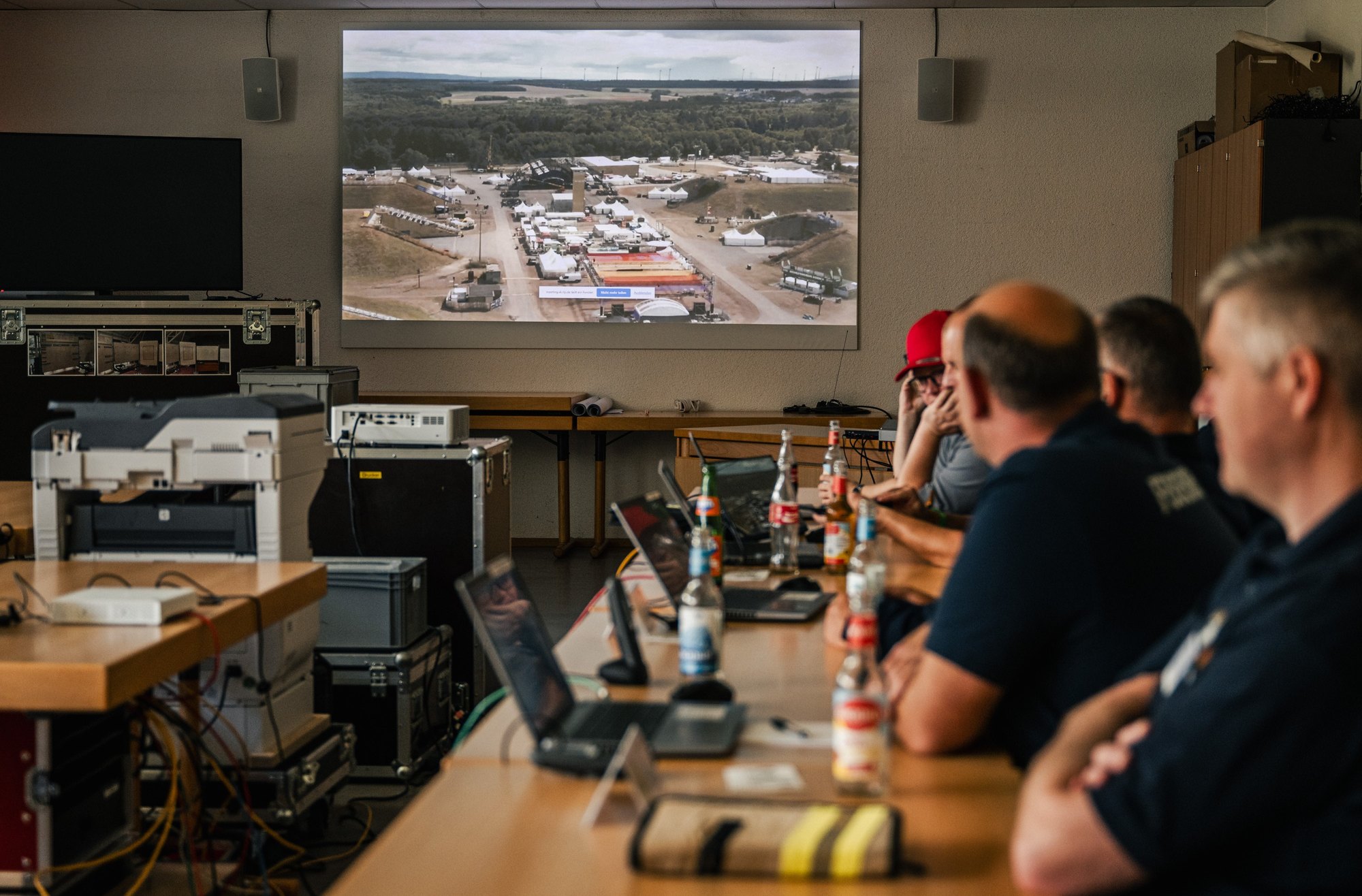 Am Samstag, 2. August, fand im Rahmen dieser besonderen Einsatzlage auch eine groß angelegte Übung der TEL statt – eine bewährte Tradition während der Festivalzeit. Geübt wurden realistische Szenarien, bei denen der reibungslose Austausch von Informationen und eine koordinierte Lagebewertung im Mittelpunkt standen. Ein besonderes Augenmerk lag diesmal auf der Anwendung einer modernen Kommunikationssoftware, mit der alle Mitglieder des Stabs in Echtzeit miteinander vernetzt arbeiten können. Auch die Zusammenarbeit mit dem neuen Lagezentrum Bevölkerungsschutz in Koblenz wurde praktisch erprobt – unter anderem durch eine Videokonferenz mit Live-Drohnenbildern direkt vom Gelände der Nature One.