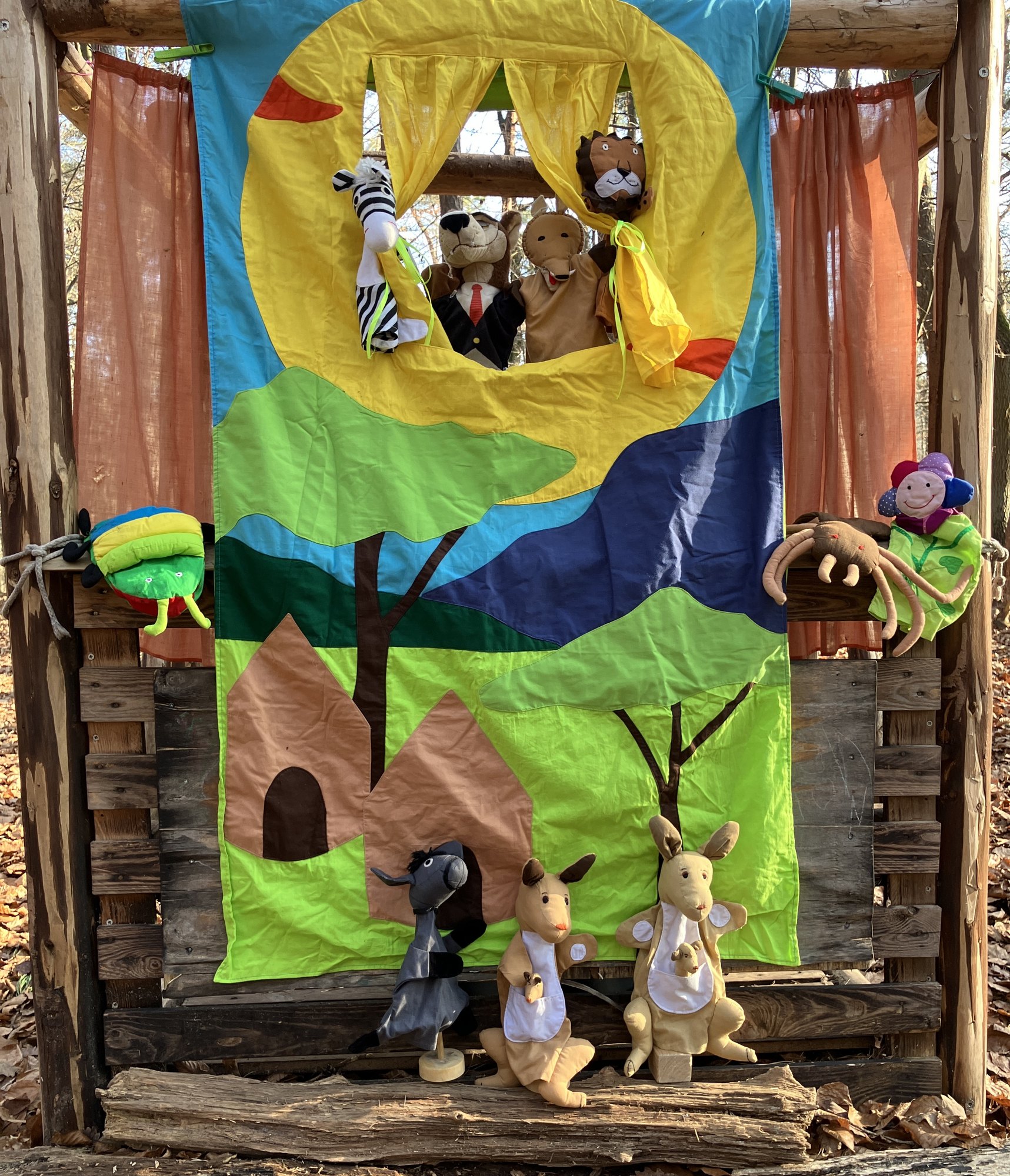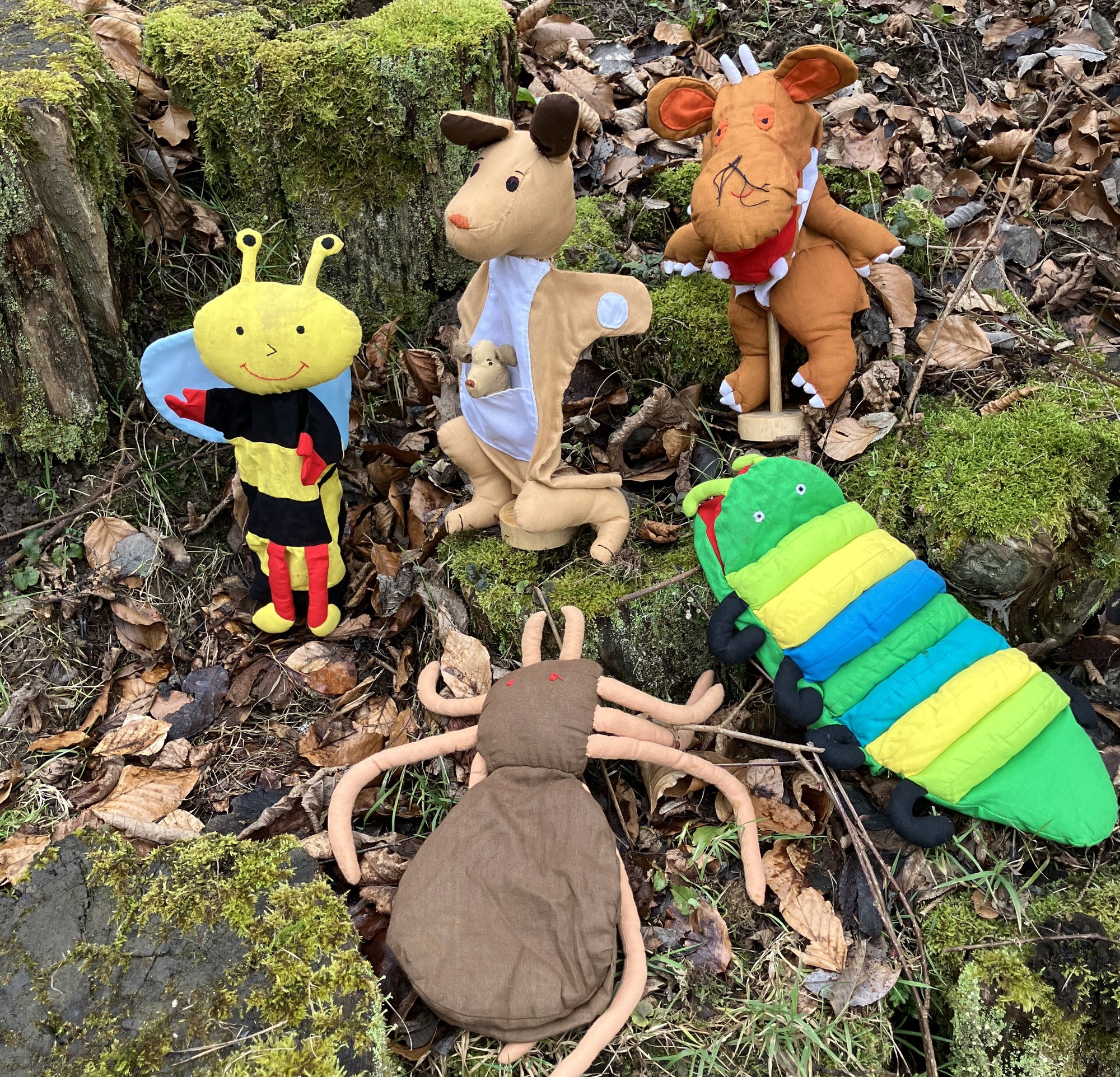 Unter anderem krochen eine bunte Raupe, eine Ameise, eine ganze Kängurufamilie, ein Löwe, ein Wolf, ein Drache, eine Biene und sogar ein Grüffeltier hervor. Es stellte sich heraus, dass es sich um liebevoll genähte Handpuppen handelte, die vermutlich bereits viele fröhliche und fantasievolle Spielstunden mit den Kindern bereichert haben. Auch ein Theatervorhang war dabei – perfekt für kleine Aufführungen und Theaterstücke.