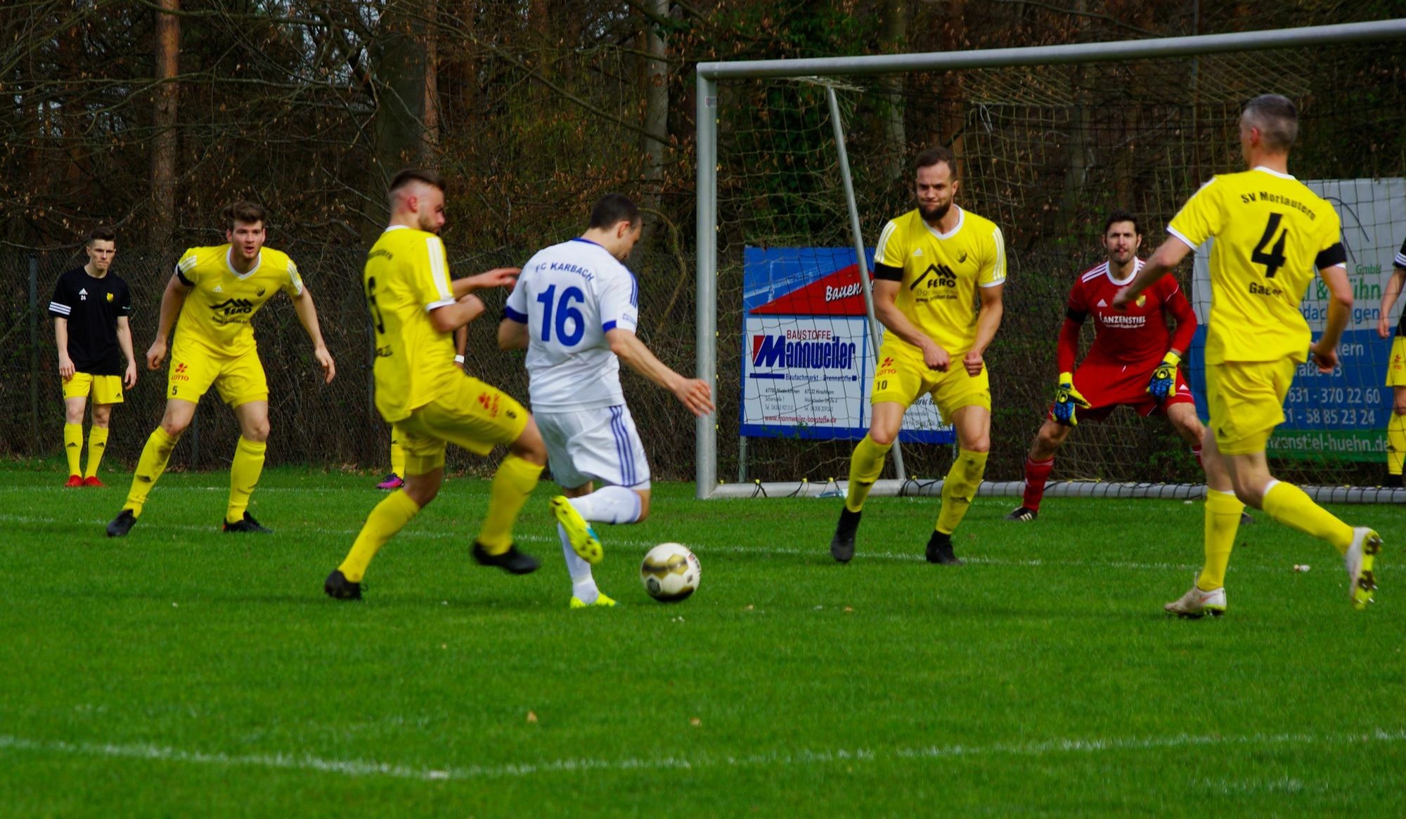 Von Arno Boes. Zunächst gedachten beide Teams auf Bitte der Karbacher dem Nachwuchsspieler Lars Dürr. Der erst 19-Jährige der zweiten Karbacher Mannschaft war plötzlich am 9. April verstorben. Gleich zu Beginn der Partie machten dann die Gäste klar, dass sie an die guten Spiele der letzten Wochen anschließen wollen. Die Morlauterner sahen sich einem guten Kombinationsspiel der Karbacher gegenübergestellt und konnten nur mit Mühe die Angriffe der Gäste abwehren. Das ging bis zur 19. Minute so. Ein Flankenball von Tobias Jakobs wurde im Strafraum abgefälscht, ging zunächst an den Innenpfosten der langen Ecke und dann über die Linie zur 0:1-Führung für die Blau-Weißen. Als dann Dominik Kunz in der 30. Minute mit einem gezielten Schuss ins lange Ecke auf 0:2 erhöhte, schien der Sieg der bis dahin deutlich überlegenen Karbacher nur eine Formsache. Aber schon zwei Minuten später kippte die gesamte Partie. Nach einem unnötigen Rückpass in den Karbacher Strafraum kam es zum Missverständnis zwischen Torhüter Lukas Schmitt und Abwehrspieler Lukas Klappert. Der konnte zwar gerade noch den folgenden Torschuss der Morlauterner zur Ecke lenken, die brachte dann aber den Anschlusstreffer für die Gastgeber. Irgendwie war damit der Faden im Karbacher spiel gerissen, fortan kamen die Pfälzer wesentlich besser ins Spiel und hatten auch zahlreiche Chancen zum Ausgleich. Mit Glück konnten die Karbacher den verhindern, in der 87. Minute aber war es soweit, das 2:2 war zu diesem Zeitpunkt für die Kaiserslauterner Vorstädter durchaus verdient. Die aber wollten mehr, denn ihr Punktekonto reicht noch nicht aus, um den Abstieg zu vermeiden. Das ermöglichte den Karbachern ihrerseits noch den ein oder anderen Konter. In der 93. Minute wäre den Gastgebern fast der Siegtreffer gelungen. Lukas Schmitt wehrte den Angriff jedoch ab, die weit aufgerückten Morlauterner kamen nicht schnell genug zurück und dem eingewechselten Yannick Rinker traf quasi mit dem Schlusspfiff zum 2:3 für Karbach. „Wir sind froh, hier das Spiel nach dem Verlauf noch gewonnen haben“, meinte Trainer Torsten Schmidt. „Damit haben wir nun 41 Punkte und können sicher für die vierte Oberligasaison planen.“