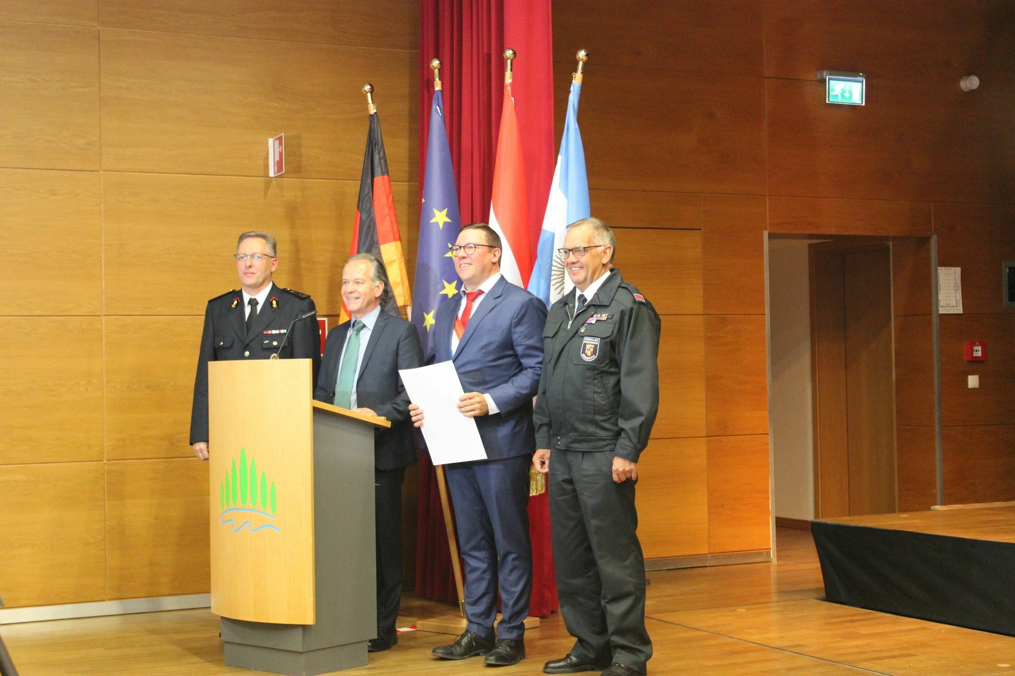 Roeser, eine Samtgemeinde (lux. Réiserbann), setzt sich aus sieben Dörfern zusammen: Berchem, Bivingen, Crauthem, Kockelscheuer, Livingen, Peppingen und Roeser. Ländlich geprägt, dem Kanton Esch-sur-Alzette zugehörig und im „Speckgürtel“ der Stadt Luxembourg gelegen, erfährt die rund 6.500 Einwohner zählende Samtgemeinde derzeit einen deutlichen bevölkerungspolitischen Aufschwung. Die einstimmigen Beschlüsse des Simmerner Stadtrats und des Rates der Samtgemeinde Roeser zur Besiegelung einer Städtepartnerschaft fanden ihren vorläufigen Höhepunkt am 28. September in der Gemeindehalle in Roeser in Anwesenheit des deutschen Botschafters in Luxemburg, Dr. Heinrich Kreft, des Vizepräsidenten des luxemburgischen Städte- und Gemeindetages, Dan Biancalana, sowie einer kleinen, indigenen Delegation der Tinkunaku-Gemeinschaft aus Argentinien. Abordnungen des Stadtrates und der Feuerwehr Simmern waren ebenfalls angereist. Beide Bürgermeister, Tom Jungen und Dr. Andreas Nikolay, wie auch der Botschafter wiesen in ihren Reden auf die Bedeutung internationaler Beziehungen hin: Aussöhnung zwischen den Völkern, Förderung der kommunalen Zusammenarbeit und des europäischen Zusammengehörigkeitsgefühls, Austausch kultureller und wirtschaftlicher Aspekte, gemeinsame Meisterung politischer Herausforderungen. Nach der Unterzeichnung der Partnerschaftsurkunden, vorgenommen von den beiden Bürgermeistern sowie dem derzeitigen Feuerwehrkommandanten Claude Damy (Roeser) und dem ehemaligen Wehrführer Karl-Willi Alt (Simmern), fand die Enthüllung eines Partnerschaftsschildes für die Samtgemeinde Roeser statt. Die Nationalhymnen von Luxemburg und Deutschland sowie die Europahymne, begleitet von der „Harmonie Municipale Réiserbann“, beschlossen den feierlichen Akt, gefolgt von einem Umtrunk. In lockerer Atmosphäre wurden interessante Gespräche geführt und erste Kontakte zwischen Vereinen geknüpft. Einen deutlichen Vorteil hinsichtlich der Verständigung bietet die Mehrsprachigkeit Luxemburgs: lëtzebuergisch, hochdeutsch und französisch. Die Feierlichkeiten fanden ihre Fortsetzung in der Vorstellung der argentinischen Delegation (Kolla-Indios), deren Partnerschaft mit Roeser seit 1992 besteht. Raymond Becker, ehemaliges Mitglied des Schöffenrats von Roeser, verwies in seiner Rede auf den klimatischen Notstand, auch mit Hinblick auf die angespannte Lage der argentinischen Indios, deren Heimat in einer Fotoshow vorgestellt wurde. (Text: Doris Wesner)