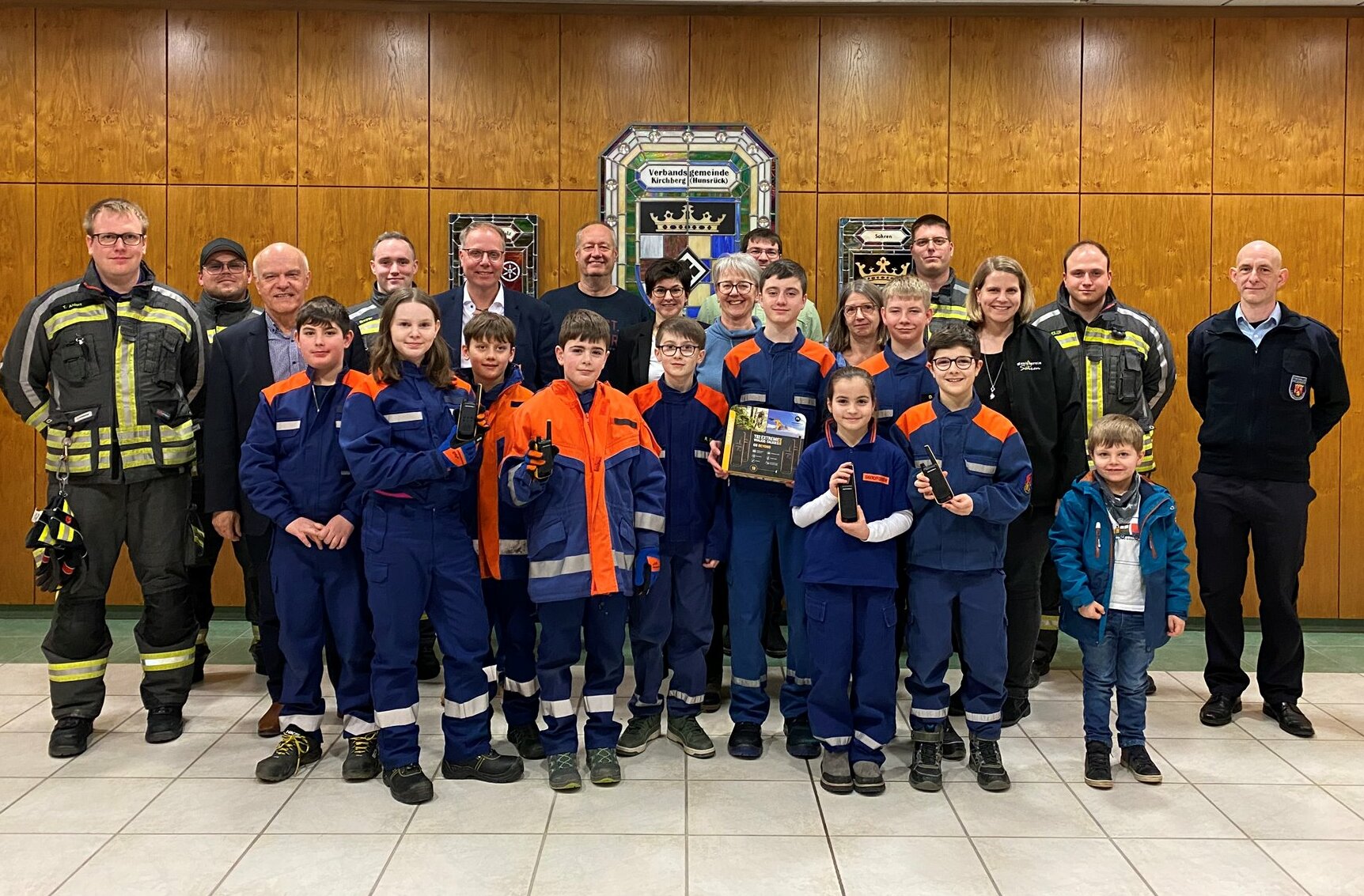 Diesen kommt der Spendenerlös mit der stolzen Summe von 2.150 Euro zu Gute. Mit den Spendengeldern werden Funkgeräte sowie Atemschutzattrappen beschafft, um den theoretischen Einsatz zu üben. Hierzu übergab Bürgermeister Harald Rosenbaum vor dem Ende seiner Amstzeit symbolisch eins von insgesamt sieben anzuschaffenden Funkgerätesets an die anwesenden Jugendlichen der Jugendfeuerwehren Kirchberg.