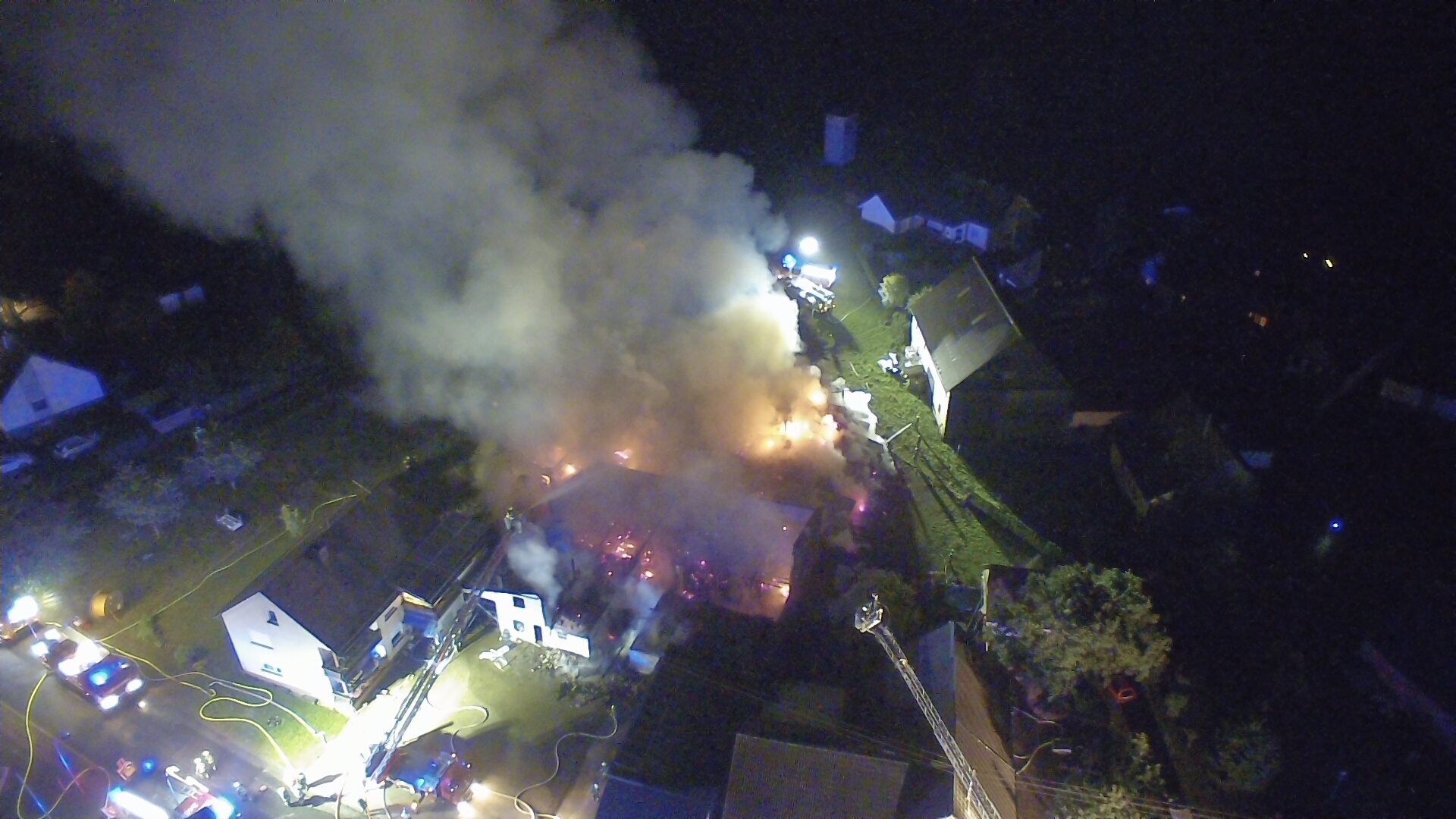 Bis auf die Grundmauern ist eine Stallung in Kludenbach abgebrannt. Den Einsatzkräften wurde der Vollbrand Donnerstagnacht, 16. August, gegen 1.15 Uhr gemeldet. Um ein Übergreifen der Flammen zu verhindern, kühlte die Feuerwehr zuerst die angrenzenden Wohnhäuser, da die Stallung bei Eintreffen nicht mehr zu retten war.